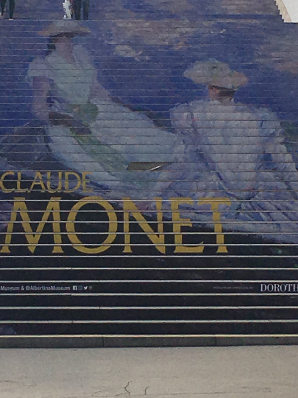 I included pics of an adult, a young black one and all of them together to show the beautiful arena. Also, on my way to see the horses I noticed they were having a Claude Monet showing and thought it was cool that they painted one of his pictures on to the stairs leading up to the museum and included that as well.