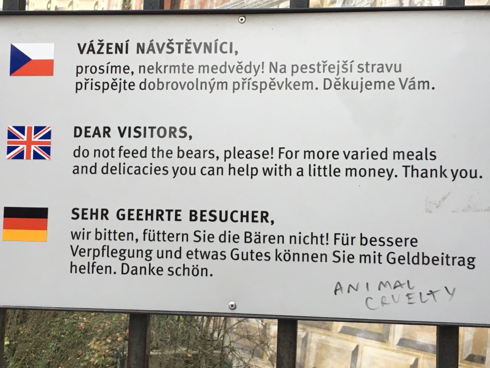 Walked up to the castle and saw where the old moat was and they actually have live bears living down in there. The bear pits hold a family of European brown bears, as they have since the Rozmberks added bears to their coat of arms in the 16th century. I didn’t see any bears but took a pic of the hilarious sign about feeding them!