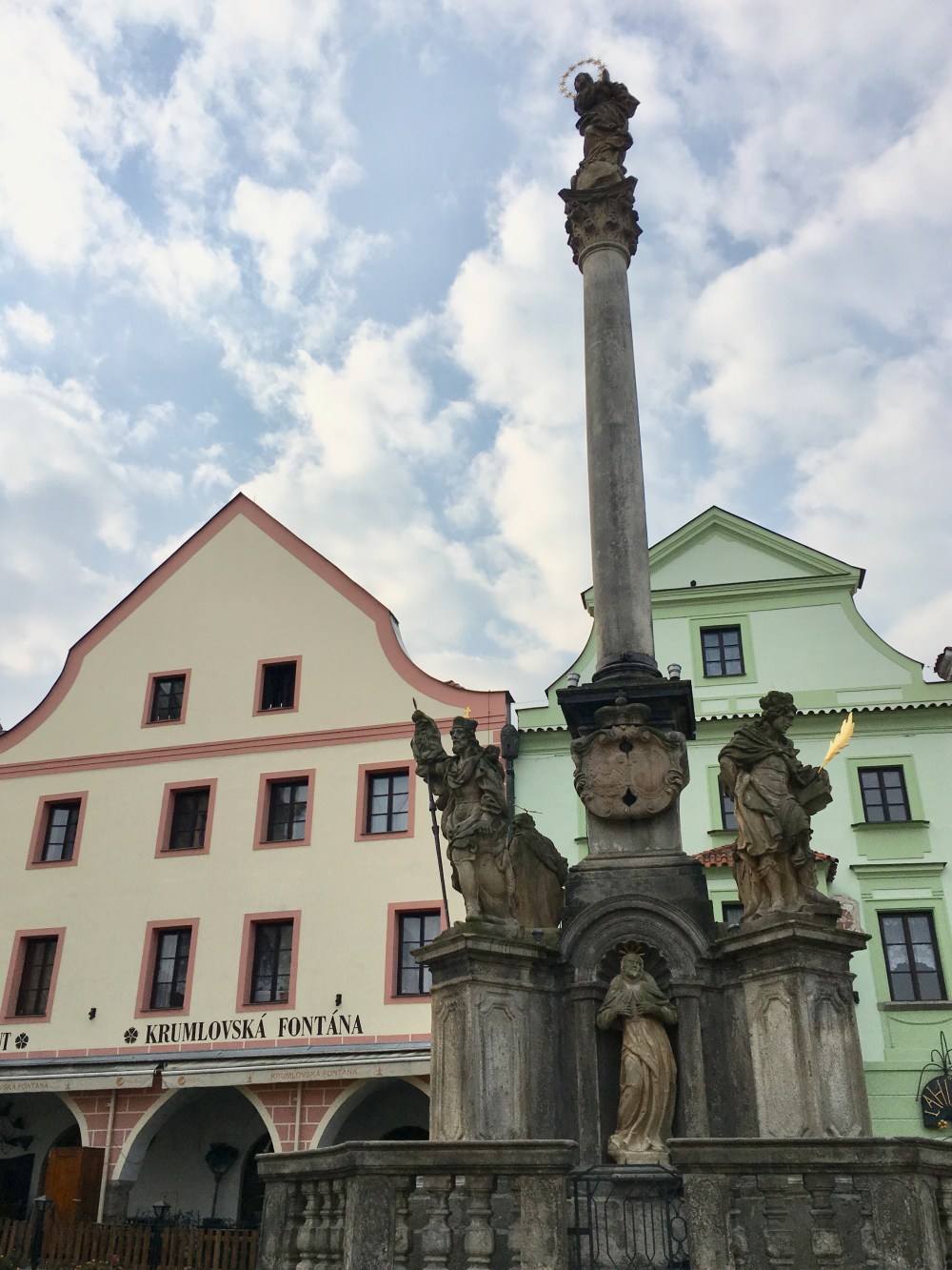 The tour guide mentioned that in 1715, the area was hit by the plague. In a nearby village all but two residents were killed by it but it stopped before devastating the people of Cesky Krumlov. So as thanks to God, they built the plague monument that stands on the main square and I included a pic of it.