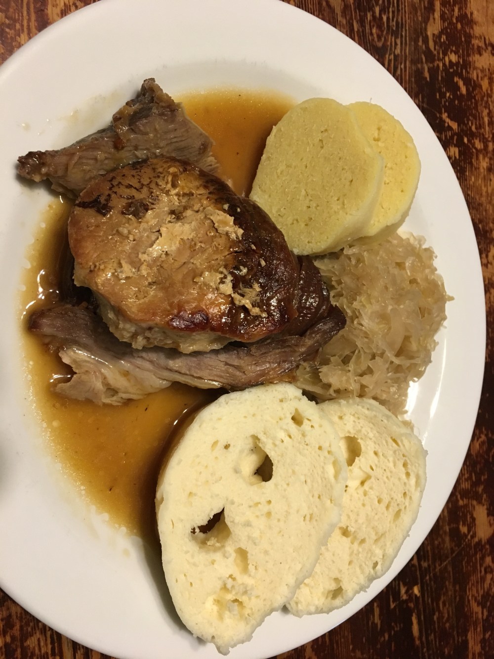 To end my day, for dinner I had the Czech National dish of roast pork with sauerkraut and potato dumplings. Must be the Germanic influence. It was good but I didn’t care for their potato pancakes. The best I had so far are the home made ones that Peter and Waltraut made for me in Munich!