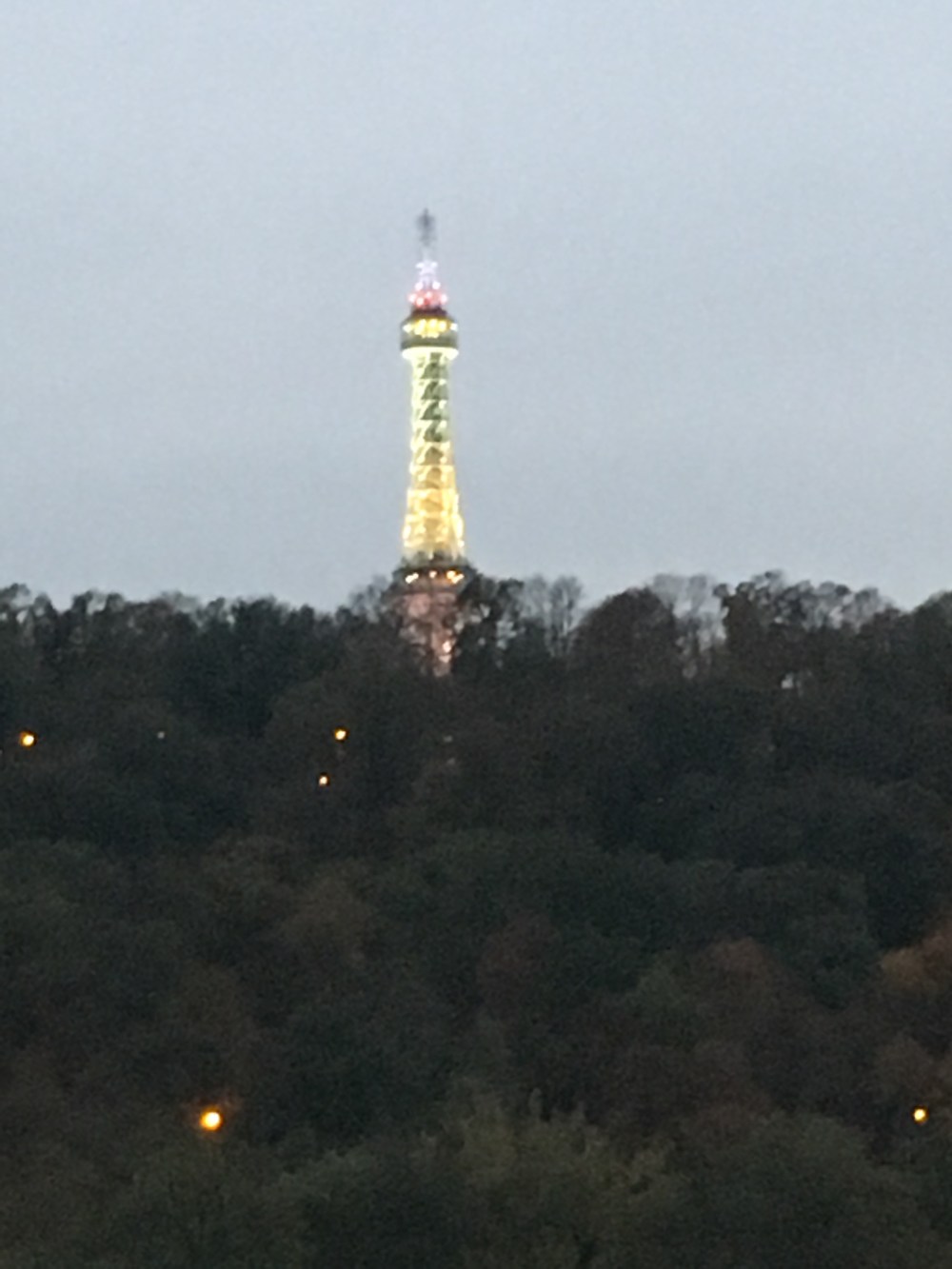 And no, for the next picture, I didn’t fly off to Paris, but this lit up structure above the trees is Petrin Tower (built for an exhibition in 1891 and patterned after the Eiffel Tower).