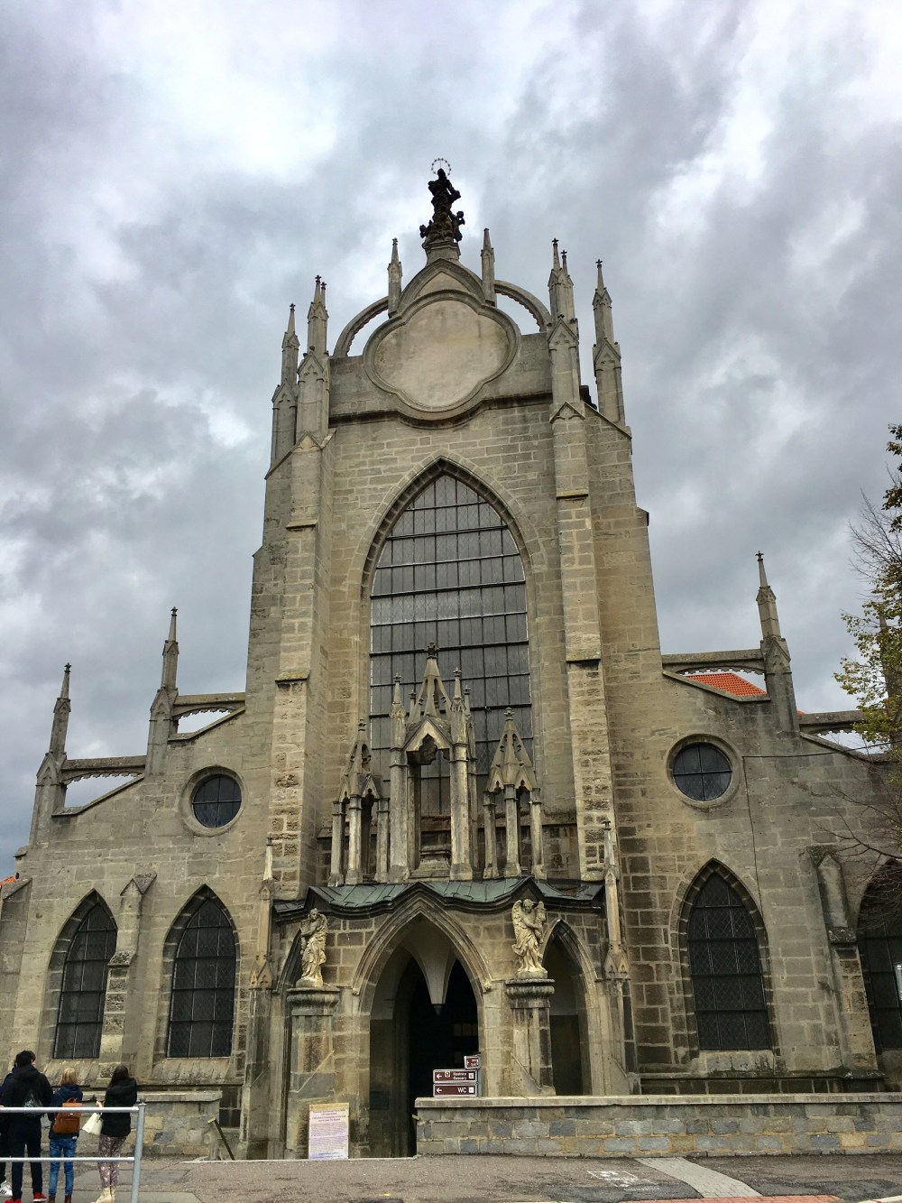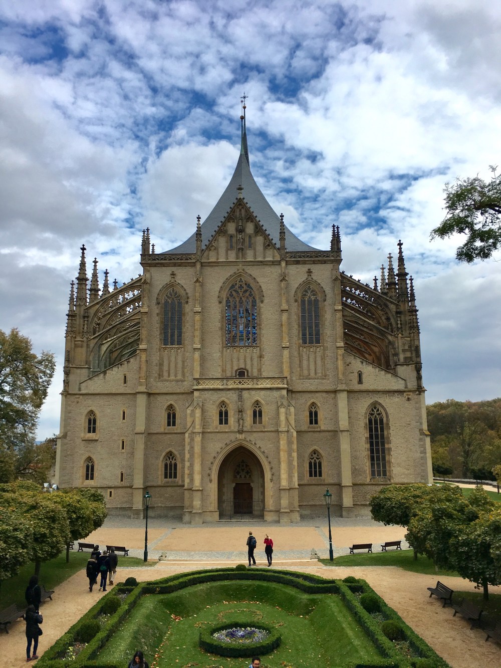 The picture of the church with the green garden in front is St Barbara’s Cathedral. The cathedral was founded in 1388 by the silver miners, who dedicated it to their patron saint. The same architects that did the massive St Vitus Cathedral in Prague did this as well.