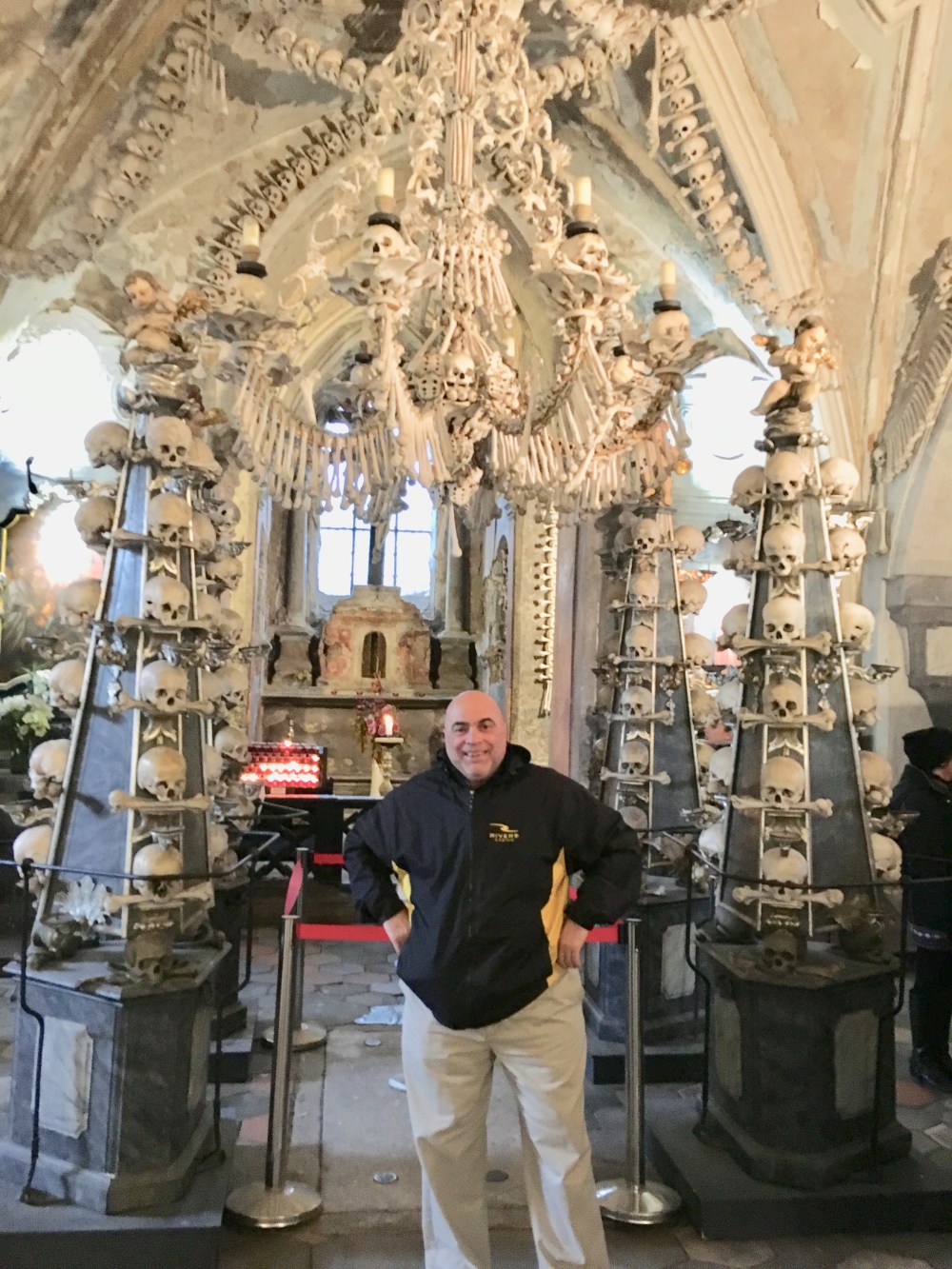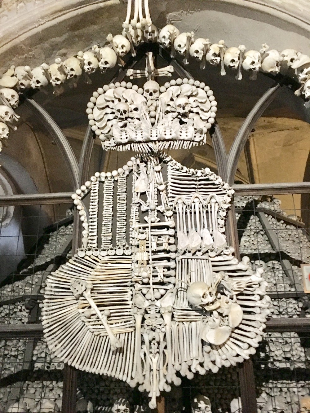 The “chandelier” of bones I’m standing in front of supposedly includes at least one of every bone in the human body (I didn’t count them!). The other Bone pic was made into a giant coat of arms of the aristocratic Schwarzenberg family (they’re following me everywhere!).