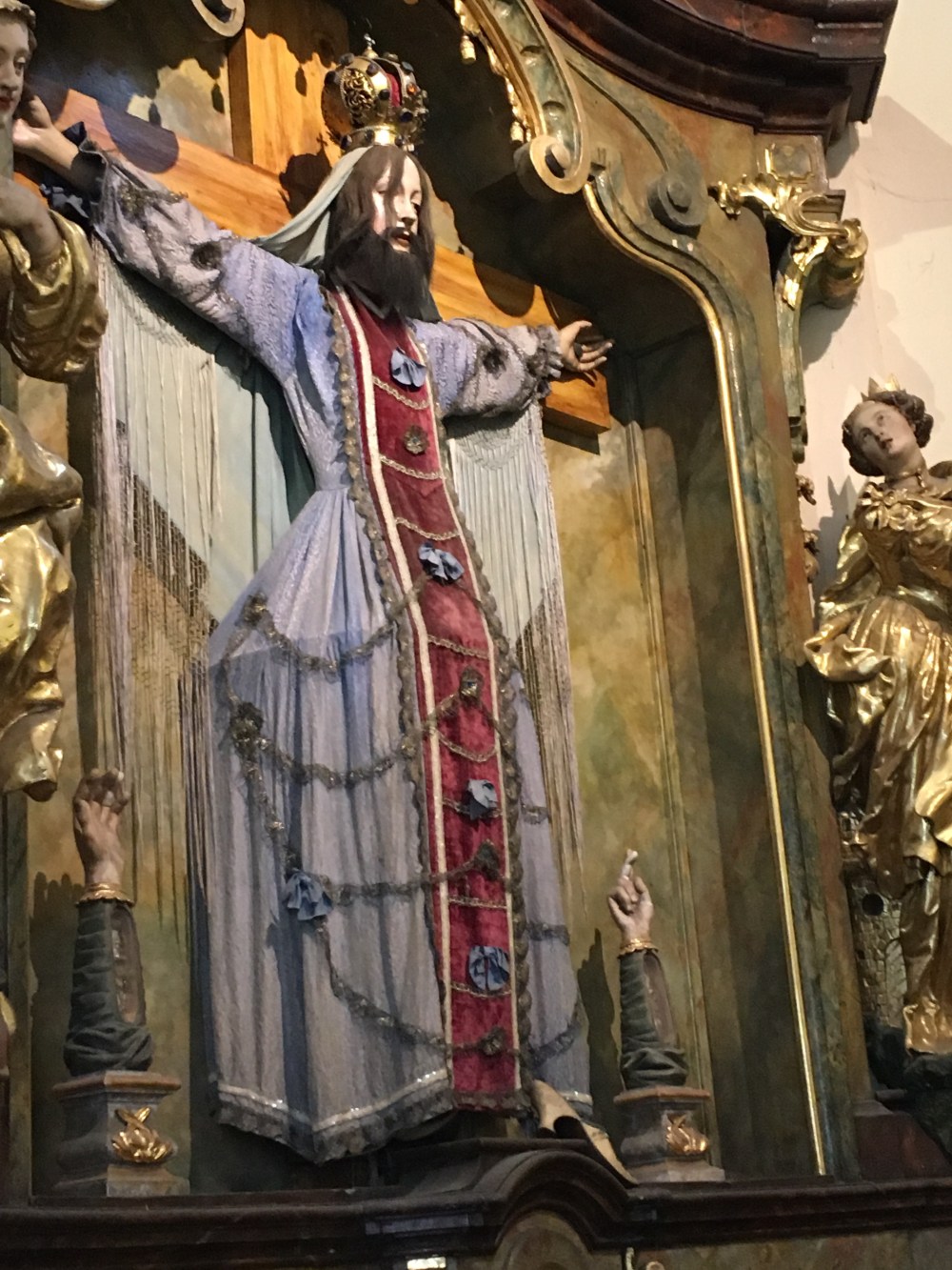 The next pic, and I promise you I’m not making this up, is the St Bearded Woman (Svata Starosta). This patron saint of unhappy marriages is a woman whose family arranged for her to marry a pagan man. She prayed for a way to get out of it and suddenly she grew a beard. So then the guy said… ummm, no way! While she managed to avoid the marriage, it angered her father, who crucified her. Very sad.