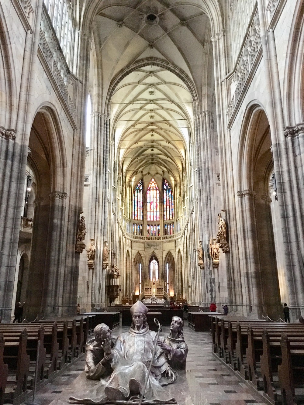 Next is the huge St Vitus Cathedral. It’s more than 400 feet long and 100 feet high. And it took almost 600 years to build! (mostly due to little things like wars and plagues!). It was started in 1344 and completed in 1929. But there was a front section of the church completed much sooner than that.