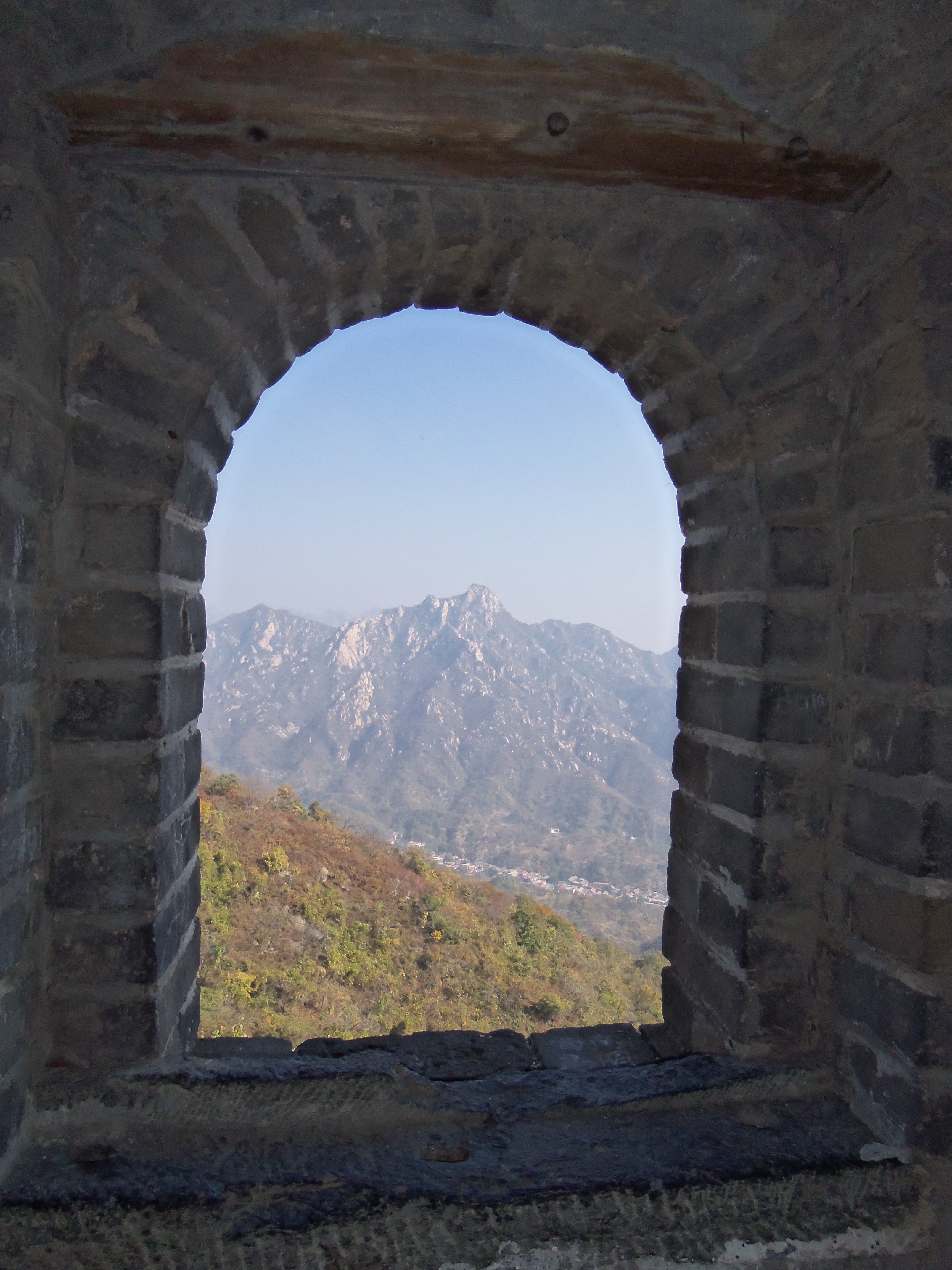 Well, my legs and feet got a break today but my heart got some shock therapy!! Remember I told you about the crazy cab driver in Hunglong careening around the mountians last weekend, well he either has his weekly job as the driver of this bus or his evel twin brother was driving it! I don't think I've ever felt a bus turn on 9 wheels around curves until today! Seriously, you would not believe how crazy this guy was driving. We're traveling along this single lane road around all these curves thru the mountains and even thru lots of tunnels and he's passing people like crazy even around bends when he can't see what's coming around the corner! He just beeps the horn and hopes they stop... and several times we really came within inches of smashing into someone head on! I've used the city bus within Chengdu and that was fine but no more long haul buses for me. Whew... He drove so fast he made the trip in 9 hours instead of the normal 10 which was nice except he left parts of my stomach back along some of those dips and turns! The countryside was really pretty that we drove thru, very mountainous and lots of really deep valleys. I tried to take several photos but they came out so blurry because he was going so fast! I did atach one at one of our rest stops. These places were a hoot. They all entailed a really nasty bathroom facility that they made you pay 1 yuan for (OK, I know that's only about 15 cents, but still!) and then it was mostly just farmers market type stalls set up with fresh fruit and nuts. It was actually pretty good some of the stuff I bought. Each place would also have the obligatory large white Yak (which is like a buffalo; you can see it to the right of the picture) and they'd charge you to take your picture with it. I actually ate a Yak burger when I was in Juizhaiguo and it was very tasty! LOL. The other thing I saw was some of the really poor living conditions for some people along the route. Very sad. There was a section that had suffered an earthquake several years ago and it still has not been repaired. There was lots of damage and it looked like whole towns were affected. Got back to Chengdu late and am just going to kick back tonight and catch up on laundry and emails and stuff. I needed this low key day after all that hiking thru the parks. I didn't have another good pic from the bus trip so I went back into the archives and found another one of my favorites from the Great Wall. I was looking thru one of the windows at one fo the main forts/stations along the way looking out towards the mountains in the distance. Cool stuff. Hope everyone had a great Halloween and a Happy November to all! Jeff PS: It's not true that large Tibetan woman have onions as a staple in their diet, it was more like garlic!! Just kidding, I got lucky and had a young Asian guy next to me that slept the whole time. When he was awake he was impressed by my tablet and so I let him play the "Need for Speed" game where you drive the car. It was sooo funny to watch him play it!