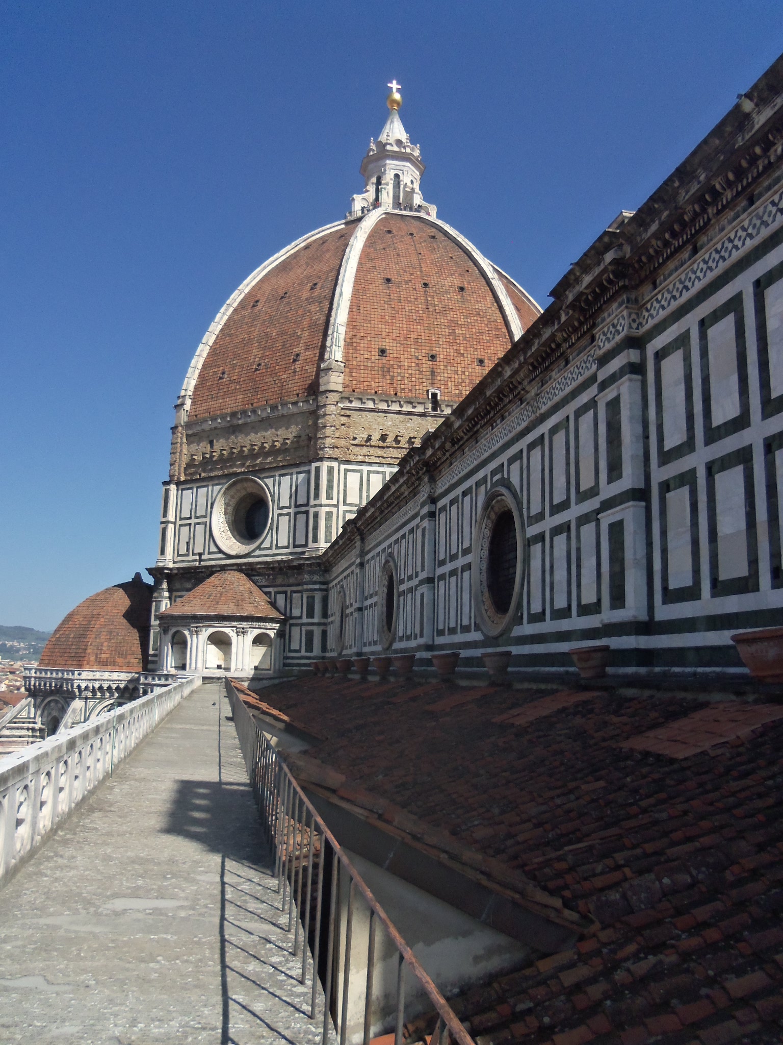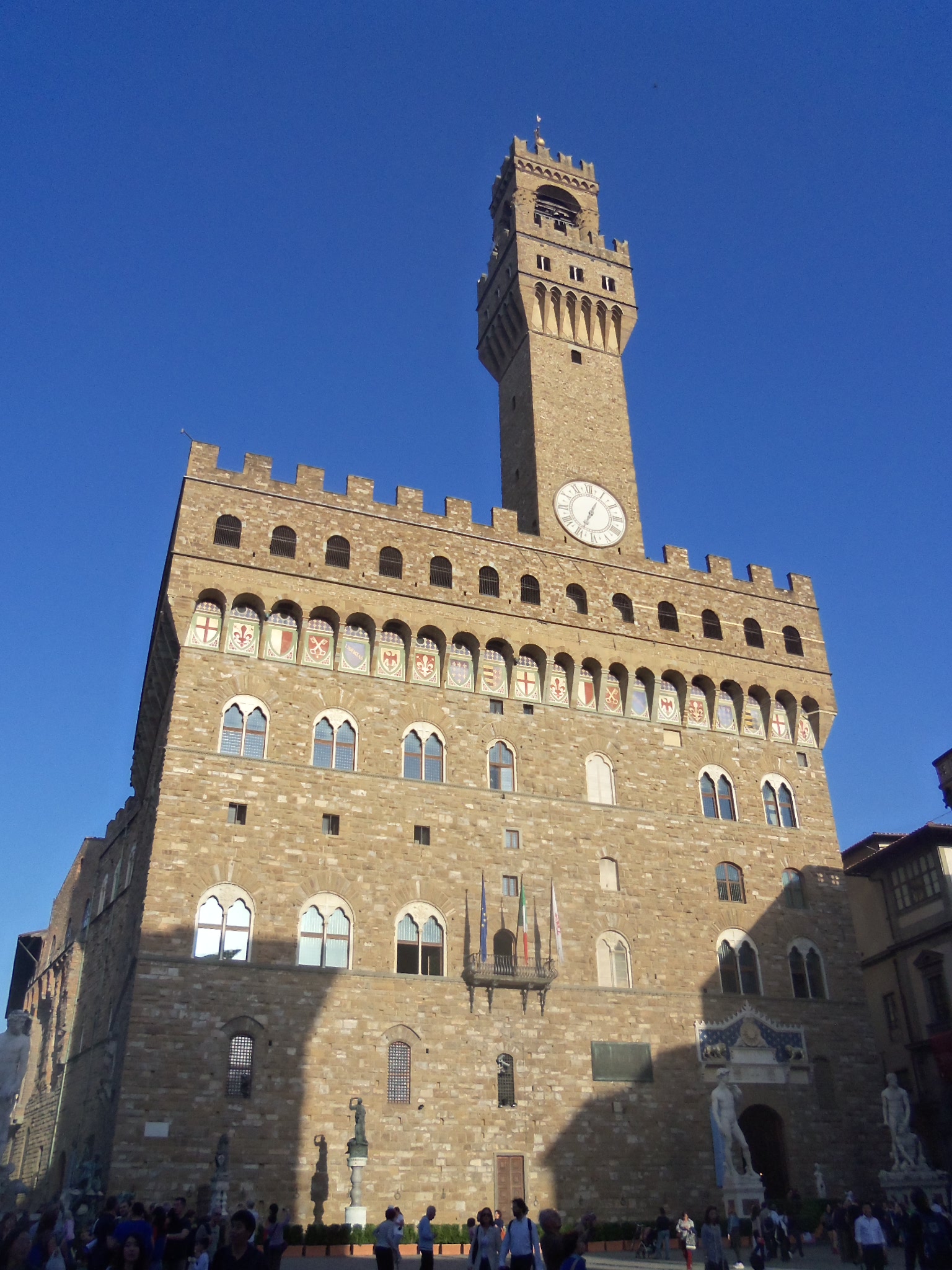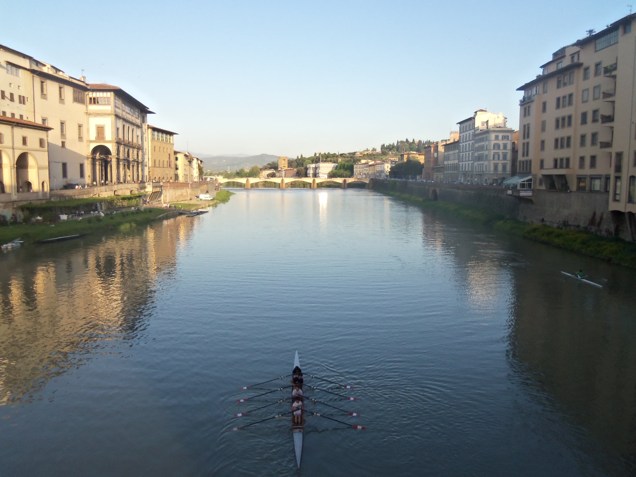 I started off pretty early this morning catching a bus and then two trains to get here. I arrived around 1:00 and got checked into my hotel. It's in a nice location not far from the train station and just a little north of the Duomo, which is pretty much at the center of Florence. As you may know, the city of Florence is the home of the Renaissance and the birthplace of our modern world. On this first day, I just took the opportunity to roam the city and check out all the sites that I'll be visiting over the next few days. It is a very pedestrian friendly city and really easy to get around. Everything is within about a 10 to 20 minute walk of the Duomo. Speaking of the Duomo, that's the classic iconic figure of Florence of the red tiled dome. It's actually the dome over a church named Cattedrale di Santa Maria del Fiore. The dome was designed by a local architect named Filippo Brunelleschi. Later Michelangelo would use this dome as inspiration for the one he did at St. Peter's Basilica at the Vatican in Rome and was subsequently imitated in our US Capitol Building and others. I took a "behind the scenes" tour where a guide took us through the church first, then up along the terraces along the inside of the dome, then outside along the dome and then finally up to the cupola on top. Whew... it was a lot of steps but the views were spectacular and I've included a few. Note that all the houses and buildings must all have the same exact red tile roof. I then walked down the main drag, which is so nice with no cars, to the Palazzo Vecchio, it's the picture with the castle type turret and rustic stonework. This building was Florence's original City Hall. I then continued walking down to the Arno River where several bridges connect old town Florence with a section called Oltrarno. The most famous of those bridges is the Ponte Vecchio where lots of gold and silver shops line the pedestrian only bridge. I included a picture of the Ponte Vecchio as well as a shot looking up the Arno river and there happened to be a crew team practicing along the river. Well tomorrow I'll get my culture on and be going into all these museums. I'm looking forward to learning a lot about the Renaissance. TGIF to everyone!!