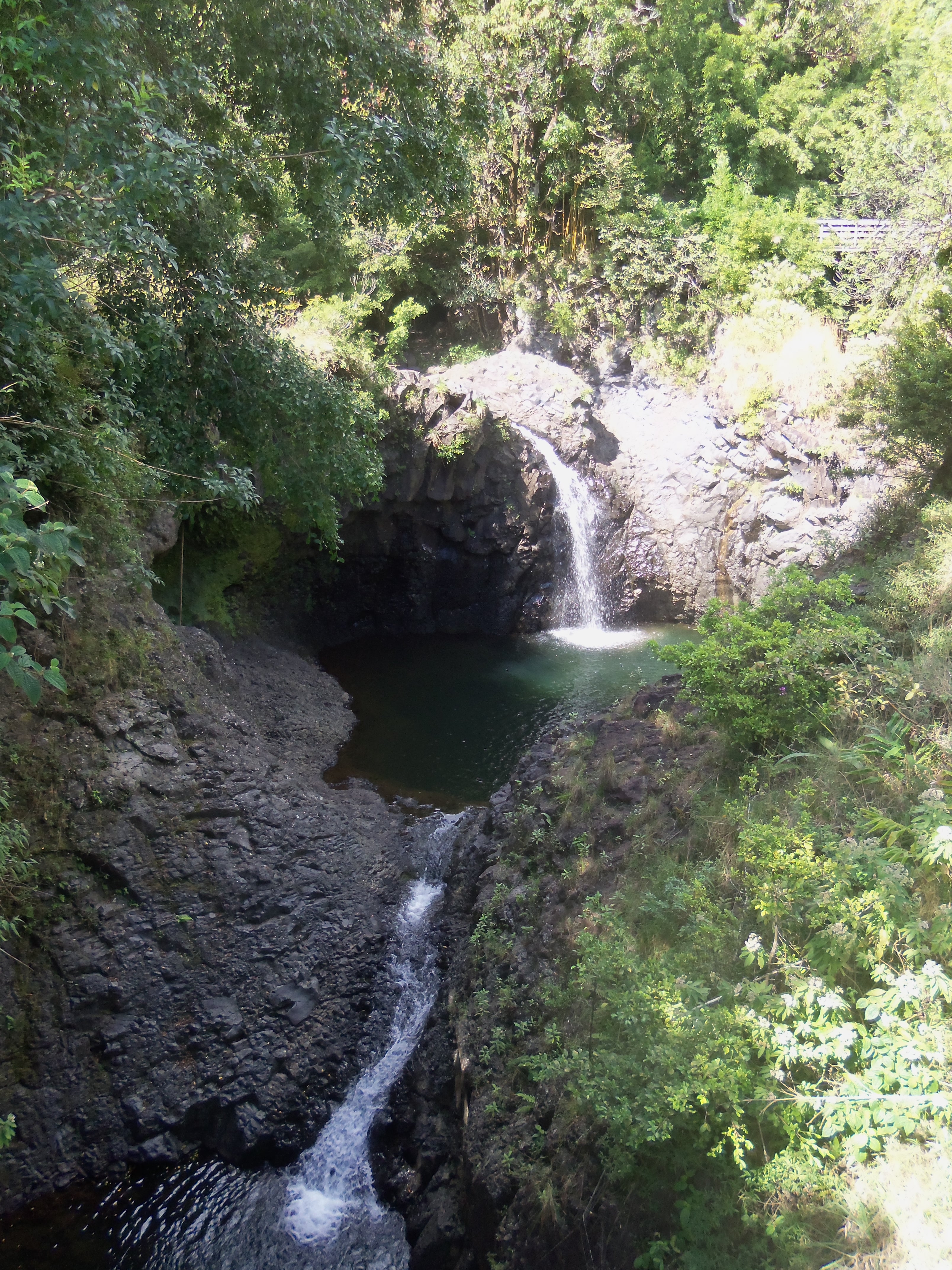 Yep, I liked it so much, I did it again! Actually, since I had spent so much time on "the journey" the prior day, I didn't have time to do it all. Today I wanted to hike in the morning and swim in the afternoon and it was a blast. And heck today, I was a pro flying down that highway... taking those hairpin turns on 2 wheels since I was used to them... NOT! It was just as crazy driving it today. The section past the town of Hana seems even more narrow and windy but maybe I was dizzy by then since I had to travel the whole road again to get to the part I wanted to do today which was the other side of the Haleakala National Park. This is where some good hiking and waterfalls are as well as the "7 sacred pools" (more on that later). So when I get to the park, right about when I pull up there's a ranger ready to lead a guided tour up to Wailua Falls. It was so informative since he explained all of the history of the land, pointed out all the mango and other trees, took us to some of the hidden spots and pretty much answered every question everyone had. That was a 3 hour hike in the morning thru a bamboo forest and up to the 400 foot Wailua Falls. It was really beautiful and it was free! Gotta love the National Park system! Then after hiking all morning, I went to grab some lunch and came back to do some swimming for the afternoon. At the park there are these various pools (they call them the 7 sacred pools but there's really more than 7). It's cool because they each feed into each other as they cascade down the mountain and eventually end up down at the ocean. So I dove in a couple of them and the water was cool but very refreshing! Of course, after swimming all afternoon and no bathroom facilities close by, those pools weren't sacred after awhile if you know what I mean! LOL. On my way back home I decided to stop back in Hana at a beach I didn't get a chance to go to which was a red sand beach. It's sort of hidden away since it's a nude beach and pretty hard to get to having to climb down a bunch of slippery rocks and stuff but with the goal of just seeing a really secluded beach (seriously, just for the beach!) I decided to trek on. It really was cool. So for a few of you crazies (like BC, Scott, Steve, Merc, Paul and of course you too Leanne), I'll send you a private email of just the nudie shots! Just kidding!! What was funny though, and I've never been to a nudist beach before, but right when I got there and got into my birthday suit and jumped in, all the nudist got up and left all at the same time! Go figure! OK, now I really am kidding! Then when I got home about 6 PM or so (I left this morning at 6:30 AM since I had to drive even further), they were having a "First Friday" street festival right outside my hostel with a band, music and vendors selling stuff. All the hippies and surfers that are staying at the hostel all headed over! It was actually pretty fun. Oh well, hope everyone has a great weekend! Jeff