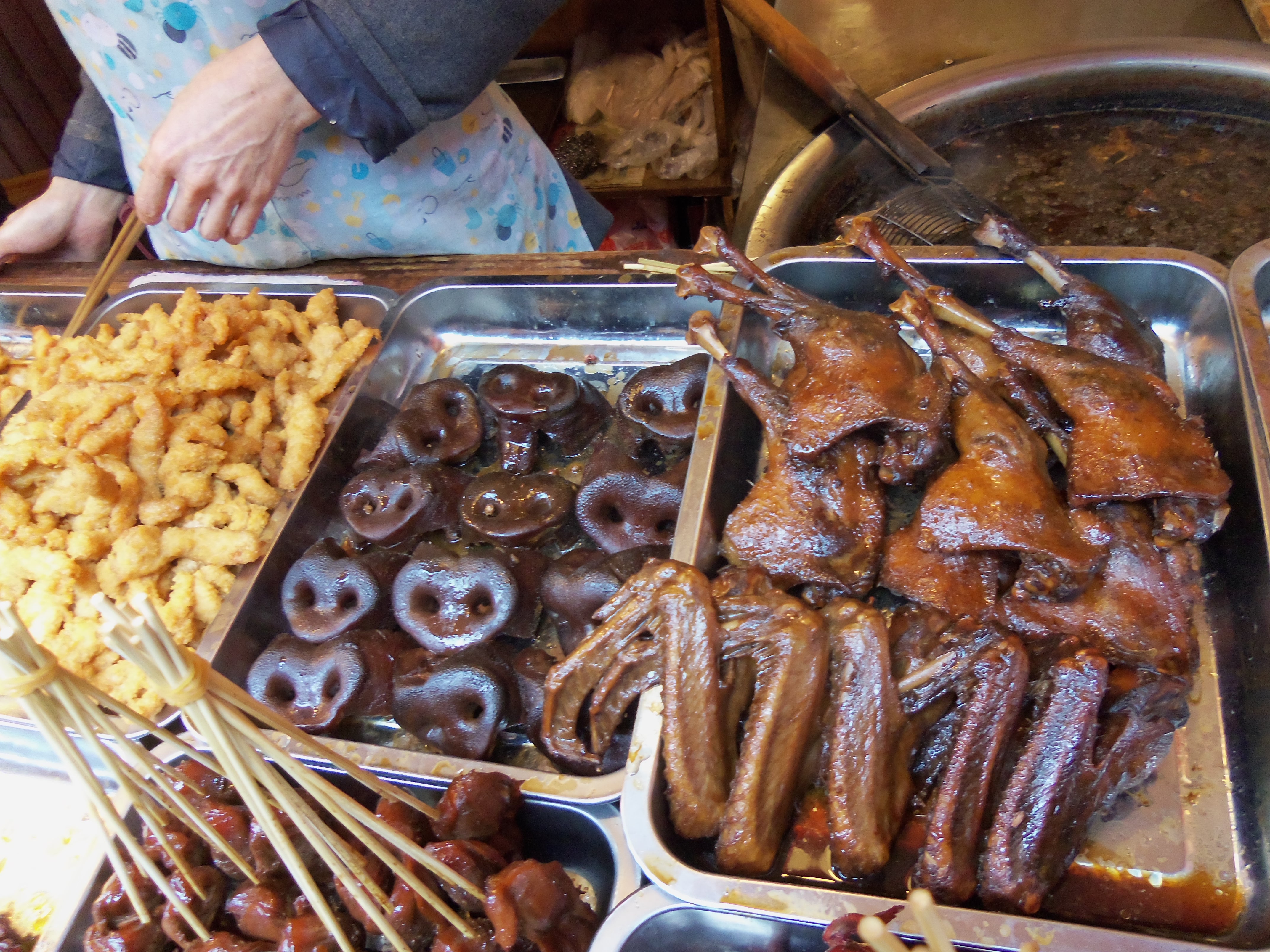 Well the sun came back out today and I got to explore around some more. Had quite the dilema since I wanted to visit one of the "water towns" around Shanghai (think Venice) and there are several all around the city with varying degrees of difficulty in getting to them. The one I wanted to go to (Hangzhou) you reach via the Maglev train, which is the high speed train that goes in excess of 280 miles an hour but it was a pain to get a ticket so I ended up in Qibao which is at the outskirts of Shanghai via the subway. Really cool town with canals all through it and various shops and narrow alleyways to traverse. Very quaint parts but also parts that were getting a little over commericalized (again, think Venice). And of course what do they have there but a street market that at first seemed to rival the Night Market, but alas, no sheep thingies! But they did have a product that you North Carolinians will really appreciate which is deep fried hog's snout! Yessiree Bob, right there on the table next to the duck wings in the attached picture! After that, I headed over to the Yu Gardens area. Beautiful Chinese gardens but also a bazaar type environment set in these old ancient style Chinese pagoda buildings. Really cool setting but again, got a little too commercial for me. Again being one of the few Westerners in the crowd I was easy pickins for the people hawking everything from fake Rolex watches to a little human traffiking (if you know what I mean). But still a cool experience. And since they had a Buddhist Temple at the same sight I had to get my religious fix and ventured in for a spin around since these are the people that gave me the 100 years to live, so I have to pay them back a little! Tomorrow I may not be writing an update (hey watch it... was that cheering I heard??) since I'll be flying out late in the evening to Chengdu. I'll still have a full day left tomorrow in Shanghai to explore and then out to the airport for an 8 PM flight to Chengdu. That's where the Panda Breeding Center is so at some point I'll be heading over to see the little baby pandas. YAY! Take care all and thanks for listening! Jeff