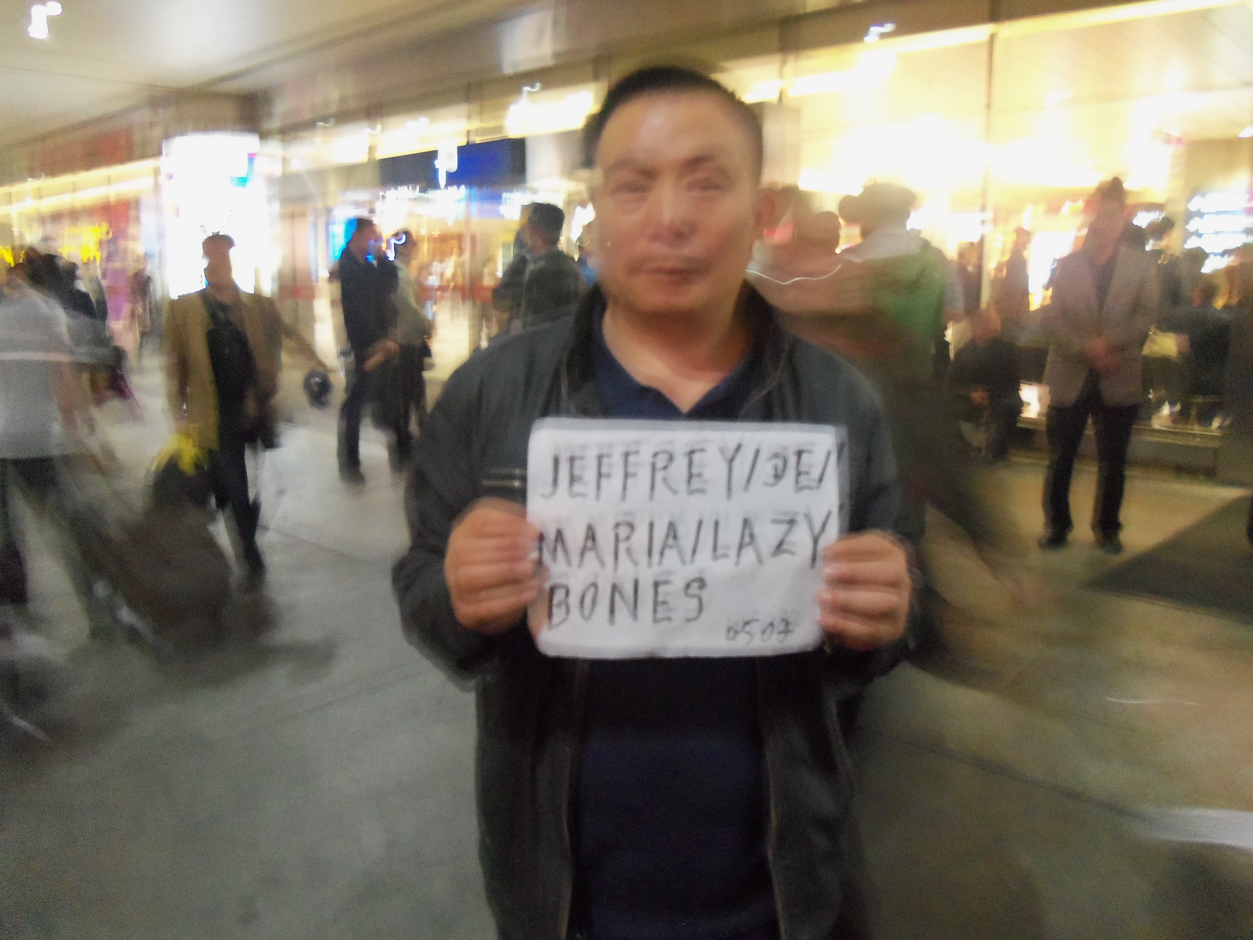 Well today was a travel day but I did get a good chunk of the morning and afternoon to walk around Shanghai. Went to a cool section of town called the French Concession that had the feel of Paris with neat little bars and shops and tree lined streets. Just wandered around there for awhile doing some great people watching. When I have time, usually on my last day of being at a place, I like to take time and just wander around seeing the behind the scenes things or as my travel messiah Rick Steves calls it (through the back door). Dang I wish he wrote travel books for places other than Europe! But I came across several cool things like a bunch of men playing cards in a park, couples just dancing away to music in the middle of a walkway and of course tons and tons of street vendors selling all kinds of fun foods. I of course had to sample some of the fun foods and tried a little sandwich type thing that was carved from meat similar to a gyro with some cooked vegetables in a little english muffin shaped bun and it was really really good but very very spicy!! Also found some fun bakery type setup but again not in a building but just on the corner mixing up stuff and baking it in these little ovens. There were some really good cookies and rolled dough types of things that were excellent. Of course I wish I could speak Mandarin or they knew English because I'd love to know what they call them but I didn't find anything I didn't like. Now we'll see if my stomach handles all of this gastronomical adventure over the next 48 hours! Another treat, and I've seen this all over, but have tried different variations of it is sort of like a peanut brittle type thing but think more peanuts and also sesame seeds and a lot less caramel/brittle part. They also make a black one that's pretty much all black with little sesame seeds in it that is really good but like wafer thin. Rumnor has it the great taste comes from tiny little bits of sheep thingy baked into it, but I'm choosing not to believe that rumor!!The only rule I follow with the street vendors is to only buy when I see lots of Chinese people buying it so I figure it must be good and semi-sanitary! So far so good! I made it out to the airport fine via the subway. Once again the Chinese airlines exceeded my expectations. So the flight leaves at 8:10 PM and we aren't airborne and stabilized until about 9 PM and so I figure, well probably just a beverage service but nooooo, they bring a full hot meal with two drink services! Unreal. Then this was too weird but there were only two Westerners on the flight and it ends up the other one is sitting in the seat right next to me, but then I realize he had stayed at the same hostel I did in Shanghai (I had seen him bot not talked to him) and he was staying in the same place I was in Chengdu. Is that too funny or what? So I had scheduled a taxi pick up service from the hostel so we just split the cab fare. Small world. Even though the picture is a little blury I thought you'd get a kick out of seeing my cab driver holding up the sign when I came out of the airport (and no that is not my new Chinese nickname after my name but it's the name of my hostel!) Today I'm off to explore Chengdu and tomorrow morning I'm hoping to go see the baby Pandas. Hope everyone is doing well. Jeff