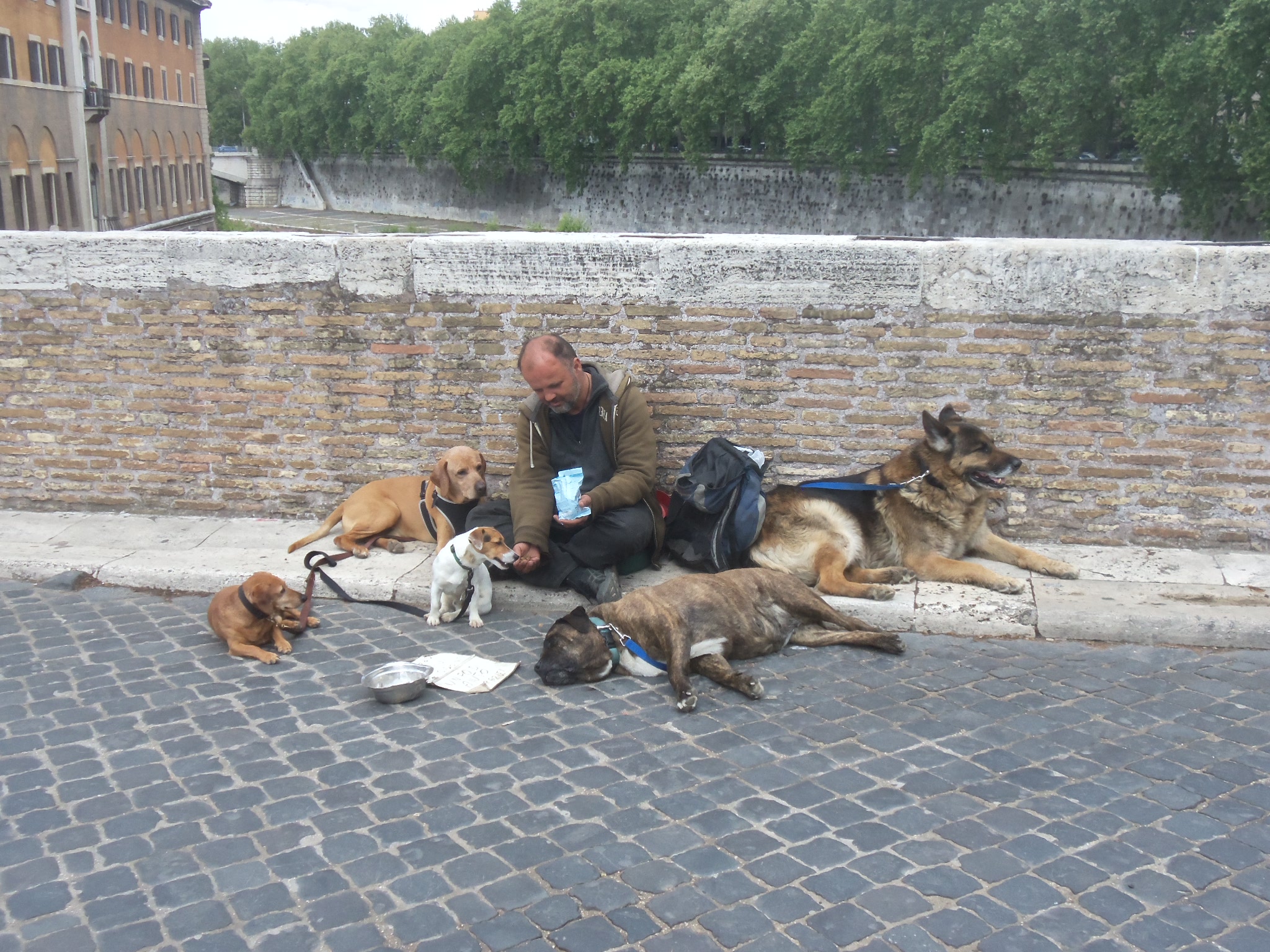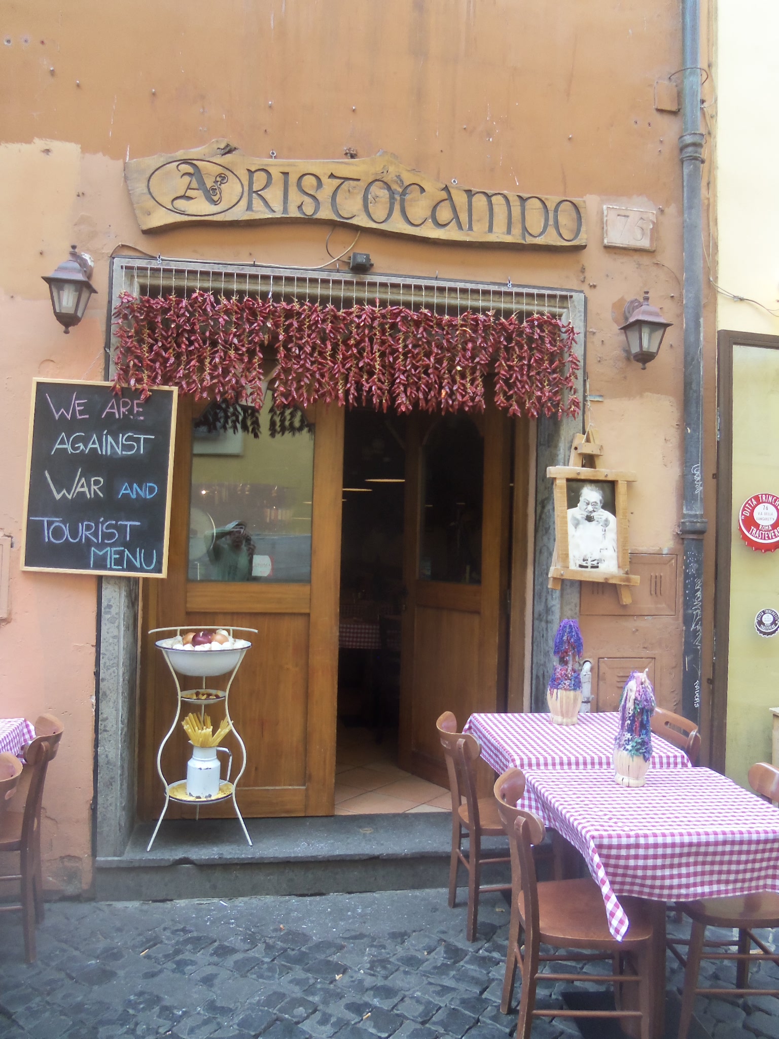 Today was a welcoming day from all the tourist throngs. The last two days I spent in the more touristy areas, so with the help of my favorite guide book guy, Rick Steve's, I had downloaded his free podcasts to my iPhone and toured the much more 'off the beaten path" part of Rome. The Trastevere section is across the Tiber river from the heart of Rome and it seems like most of the people there want it that way. It feels like old time Rome many centuries ago with little shops and narrow alley ways. Not many tourist at all. One of my pictures of a cute little restaurant there with their sign out tells the story. And even the beggars are nicer! I had to take a pic and drop some money in for the guy with all the dogs. I'm a sucker for doggies. Yeah I know, the cynics in all of you are saying, he's just taking the money for himself... oh well. Rick also lead my to an awesome pizza place that was magnifico! Then I ventured back across the Tiber to the Jewish Ghetto area. This was an area of only 4 blocks that the Romans forced all the Jews to live in and they built a wall around it to keep them in. Good thing about that was, they missed the great plague that went thru Europe, so putz on you Romans! 🙂 This area too was less touristy and very quaint. Of course here Rick led me to some really good Jewish bakeries where these cute little Jewish grandma's hand made the goodies. I took a pic of the ruins of the Theater of Marcellus which sort of looks a little like a smaller version of the Colusseum but actually predates it. I then had to get my catholic genes tuned up for my visit to the Vatican tomorrow so I visited some really cool churches. First was San Clemente where I couldn't believe it until I saw it but it's a 16th century church on street level, you go downstairs and there's a 4th century church under it and you go further down and there's an old pagan village with houses and schools. It was unreal. Then I went to the church of the Scala Santa (Sacred Stairs) where the steps that Jesus climbed right before his death have been placed. Devout Christians climb the stairs on their knees to the top ( see pic). No, I didn't do it... dang that would hurt! That's all for now. I also slipped in a pic that I saw that was the closest to my last name and I got a kick out of it! Have a good one!