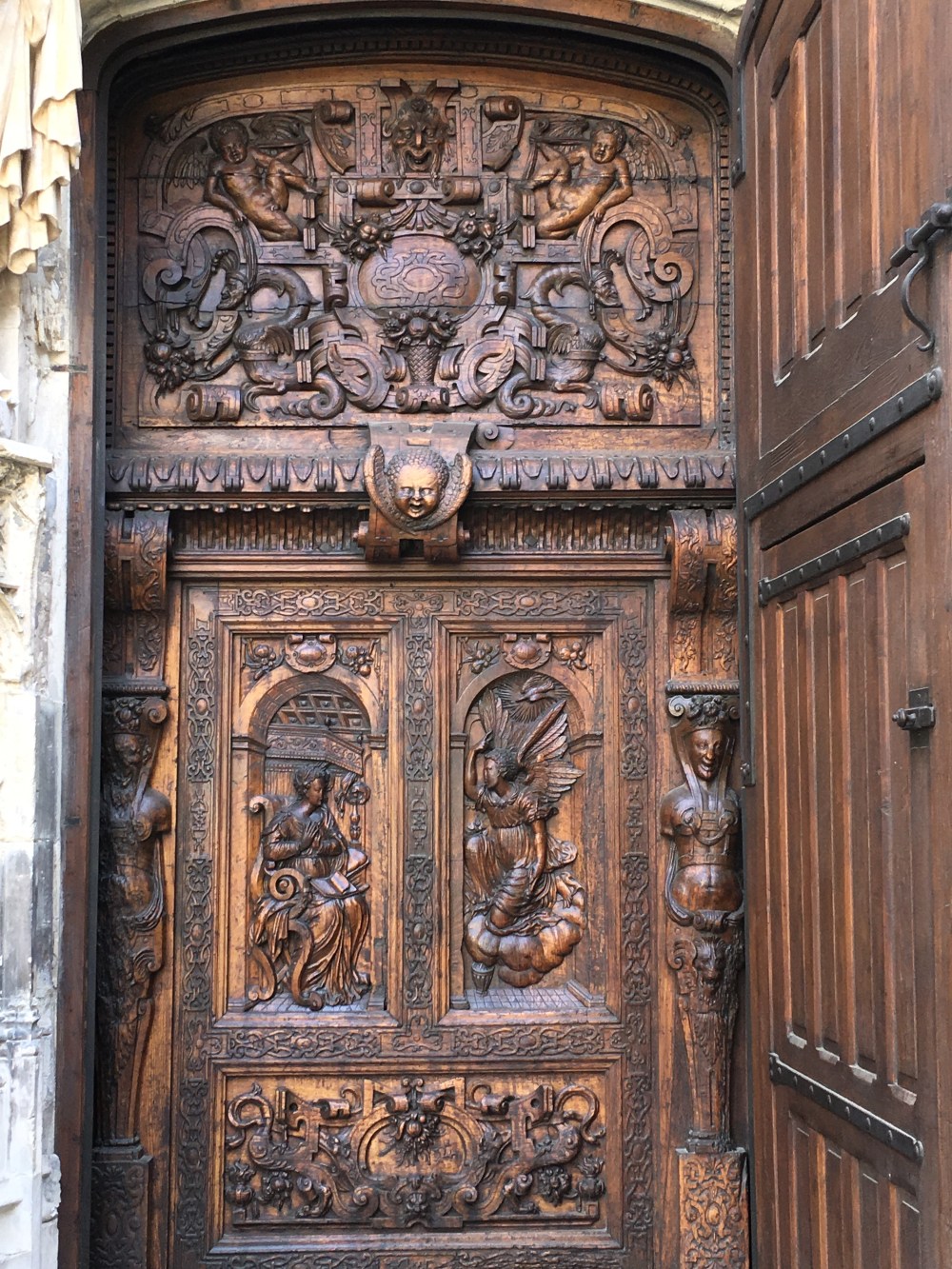 The remaining pics are just shots I took around town looking down cute little alleyways (sound familiar!) and cool buildings. The pic of the wooden door is from the church of St. Pierre and is made of walnut and was carved in 1551. Amazing!