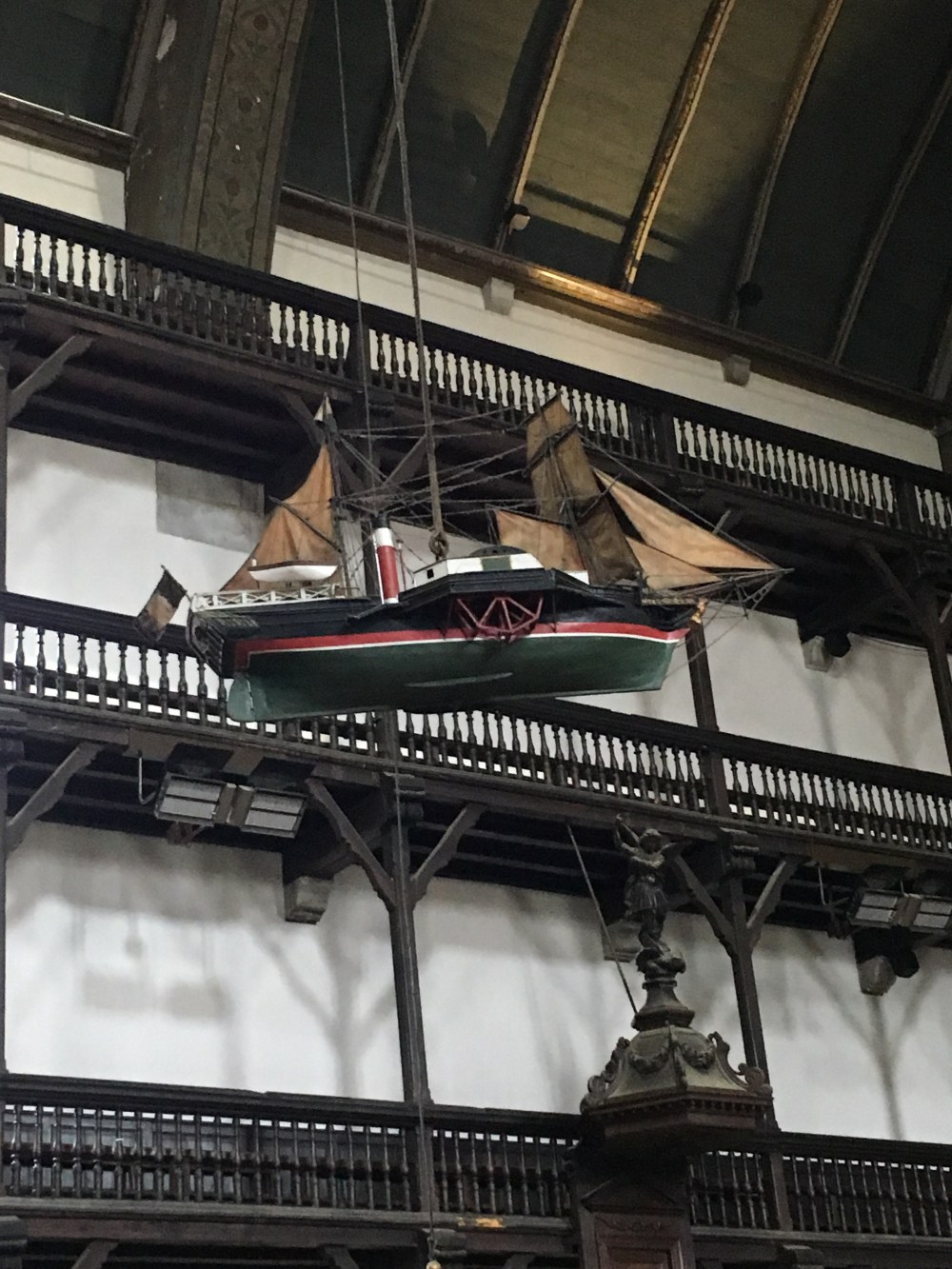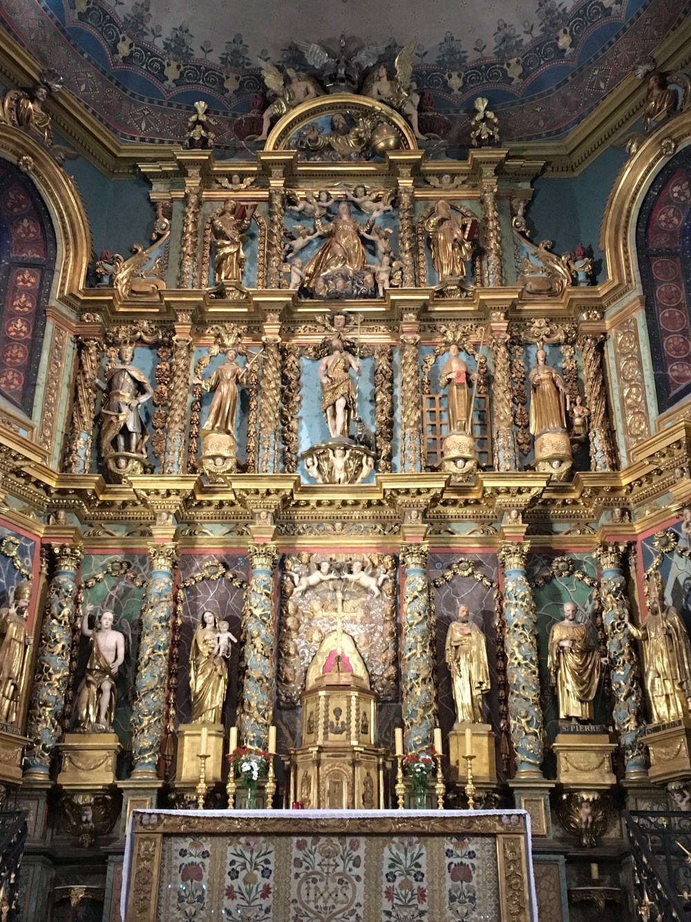 The first two pics show a little of the inside of the church. The three foot long paddle wheel ship hanging from the ceiling was a gift from Napoleon III’s wife, Eugenie. It’s a model of an ill-fated ship that had almost sunk just offshore when she was on it. Behind the ship you can also see the dark wood balconies which segregated the men from the women and children. The number of levels of balconies depended on the importance of the church and this church, with three levels, is the largest Basque church in France. The 1670 Baroque altar features 20 French saints with the city’s patron saint, St. John the Baptist, placed prominently in the center.