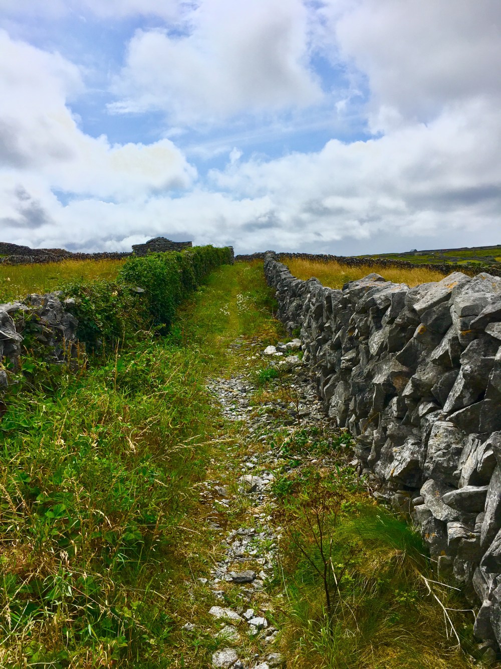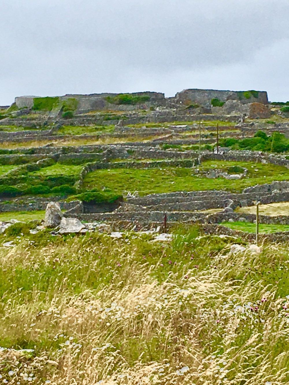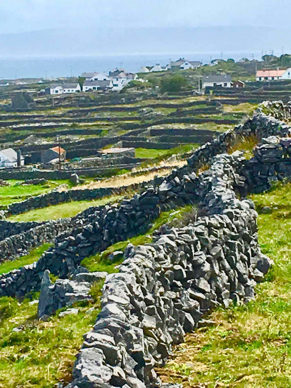 As you can see from the pictures, there are several thousand miles of “drystone” wall (made without mortar). Most of these are built in the Aran “gap” style, in which spaces between angled upright stones are filled with smaller stones. This allows a farmer who wants to move livestock to dismantle a short section of wall as a temporary gate, and then rebuild that section afterwards. It also allows the harsh winter winds to blow through without knocking down the wall.