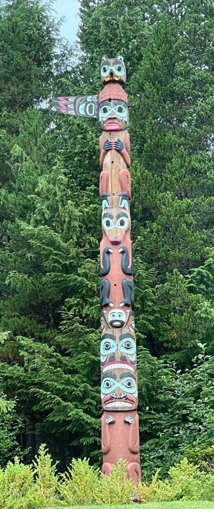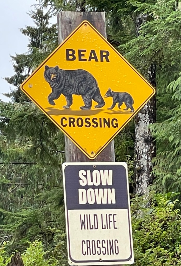 So Kathy and I did a tour around the area and Dan and Jen walked the town and did stuff on the boat. We were hoping to see some bears when we stopped near a salmon hatchery but didn’t see any. But we did see a Bear Crossing sign! We then went to a Totem Pole park where there were lots of Totem Poles all with meanings about the indigenous people of Alaska.