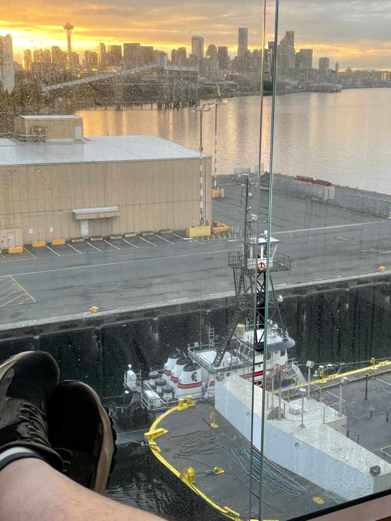 We once again enjoyed the benefits of purchasing the “Key” program since it gave us a final sit down breakfast where we got served (you know how we love our food and service!) and also afforded us time to relax on the balcony and see the beautiful early morning view of the sun rising over Seattle. So after breakfast we grabbed our luggage and were quickly off the boat and in a taxi on the way to the airport.