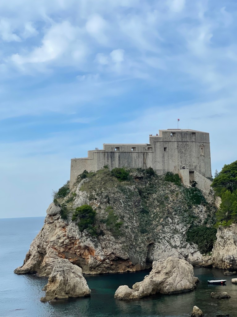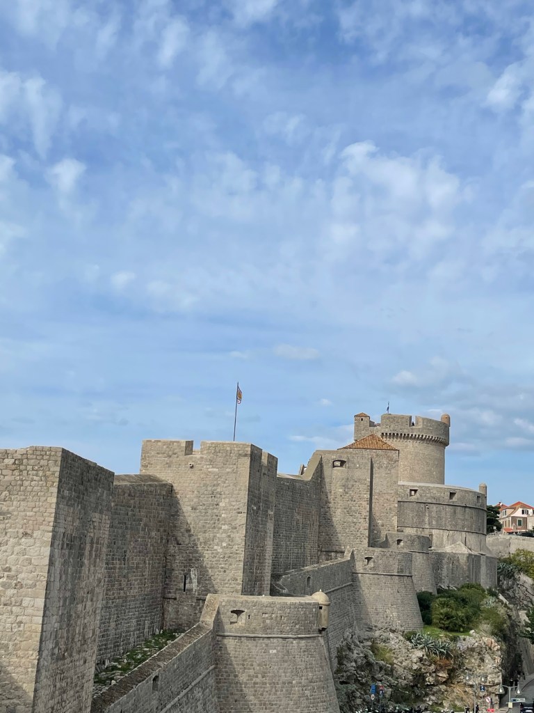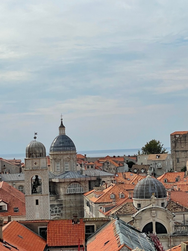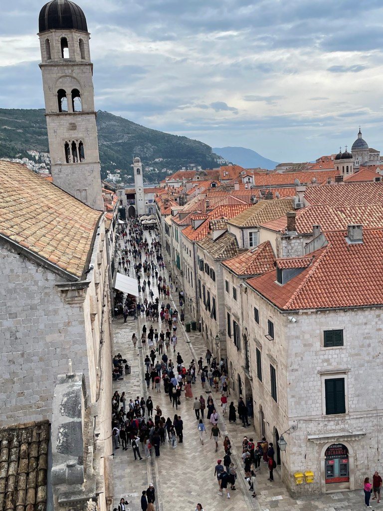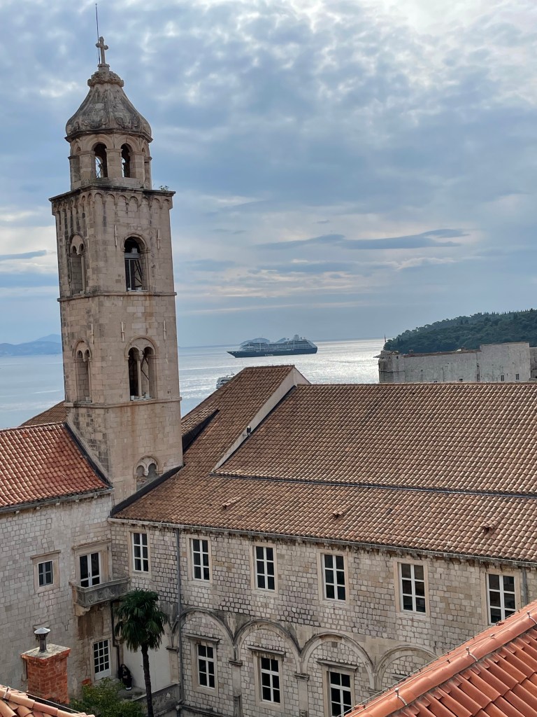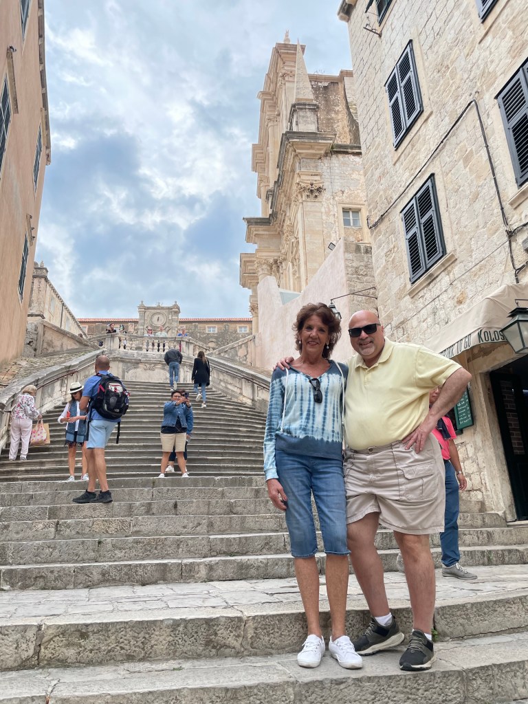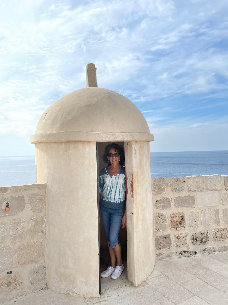 Three of the 41 churches!Franciscan Monastery!Beautiful wall structures!Lots of orange roofs!Looking down in the Main Street!Fort protecting the walled city!Kathy peeking out of the sentinel station!At the replica of Rome’s Spanish Steps and the GOT Walk of Shame location!Looking down on beautiful Dubrovnik right before sunset!Looking down on our ship from Mount Srd!