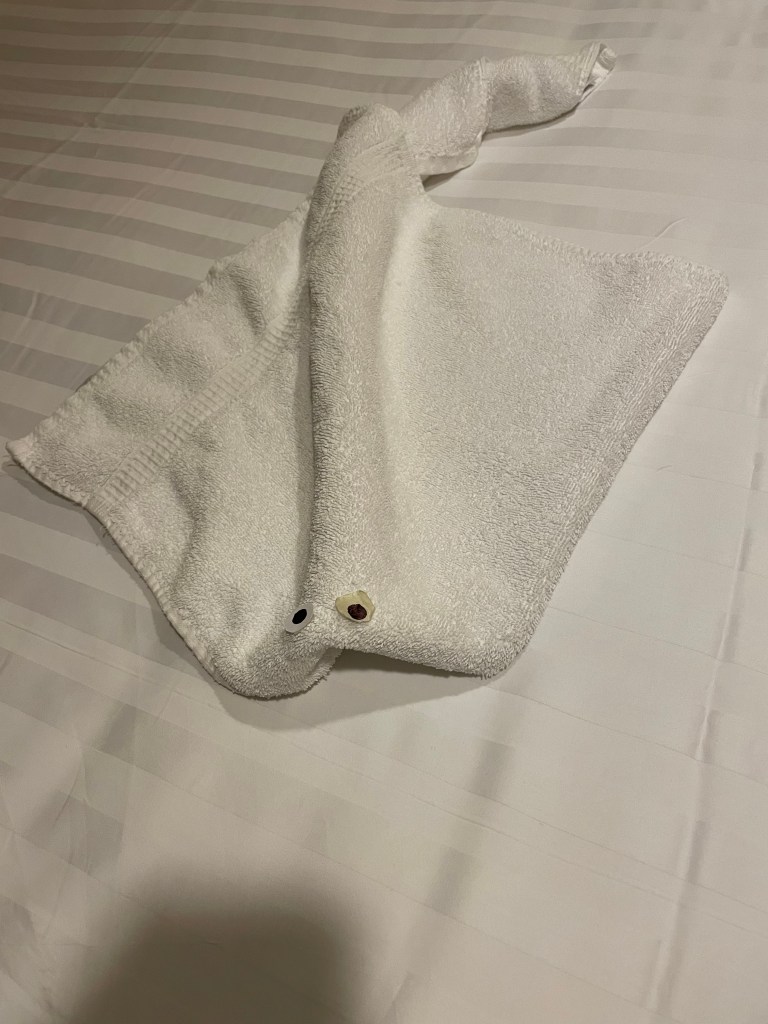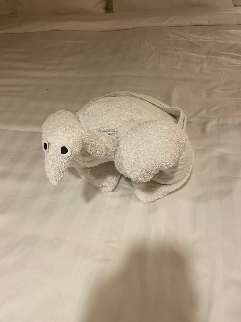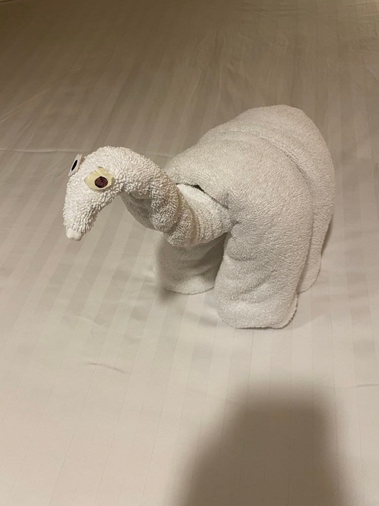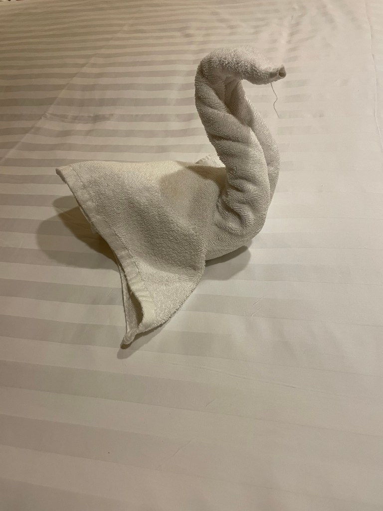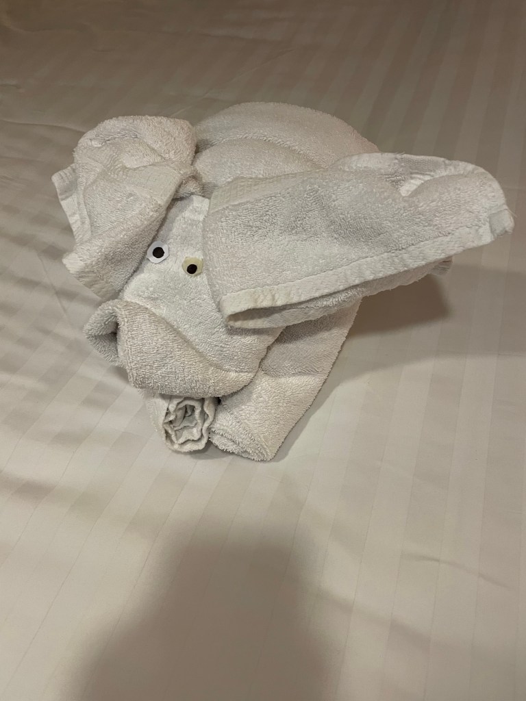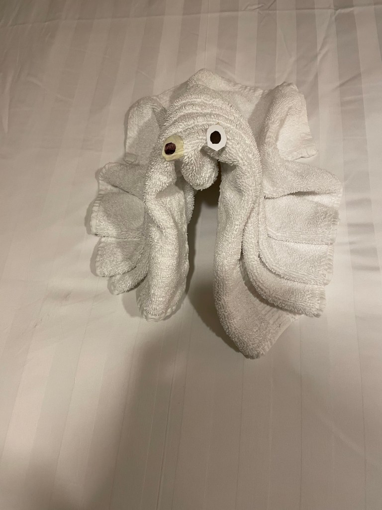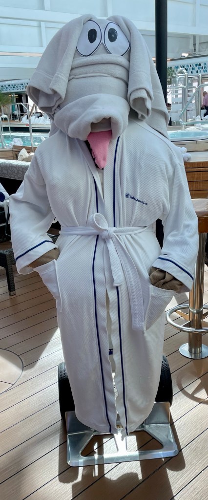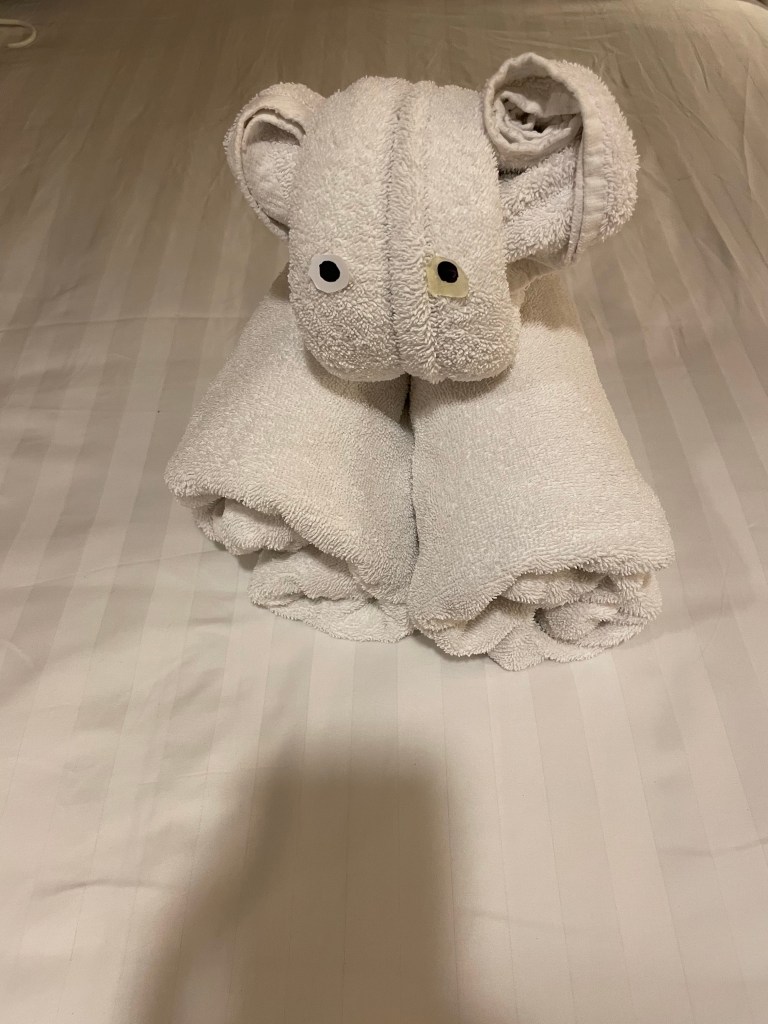 I’ll leave you with a sample of cute pictures of the towel animals our room steward made for us each night. His name was Agus and he was great. See if you can tell what each animal is? The last one was not done by Agus and was out in the pool area. That’s the wildest one!