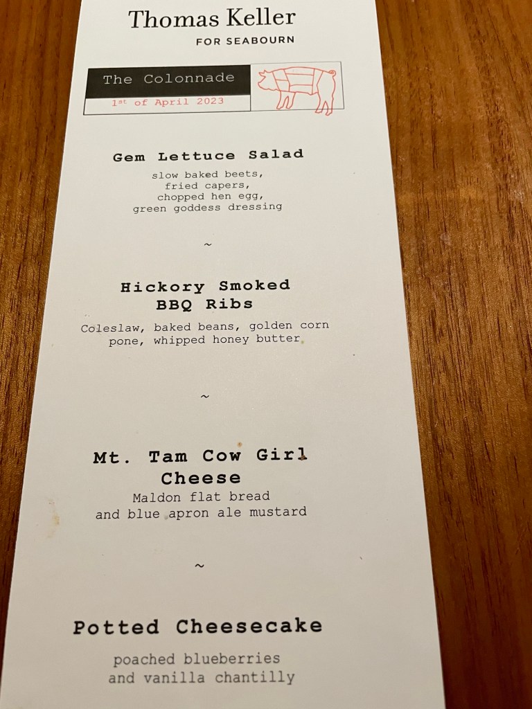 Posted on April 2, 2023 by Jeff DeMaria Our menu for dinner tonight! First Course – Salad! Second Course – Ribs, baked beans, cole slaw and corn bread! Third Course – Cheese, mustard and flat bread! Fourth and Final Course – Blueberry Cheesecake! Share this: Click to share on X (Opens in new window) X Click to share on Facebook (Opens in new window) Facebook Like Loading...