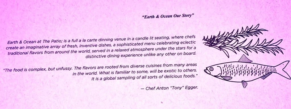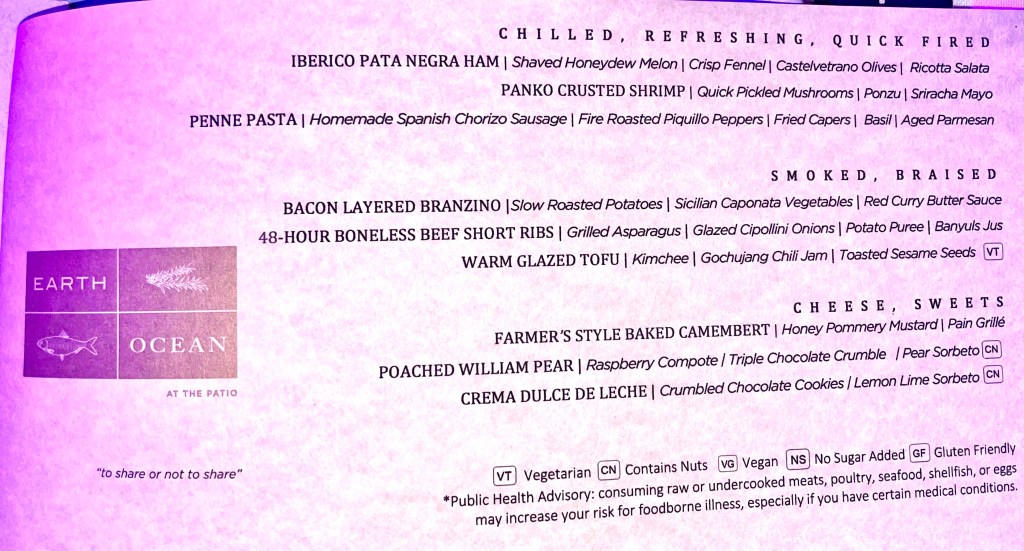 My three lobster and assorted goodies lunch!The Story of the Earth & Ocean restaurant!Earth & Ocean’s menu!Dining Al Fresco!Panko Crusted Shrimp with Sriracha Mayo!Iberica Ham with shaved honeydew, fennel and castelvetrano olives!Beef short ribs… Yumm!Lemon lime sorbet with dulce de leche and crumbled chocolate chip cookies!