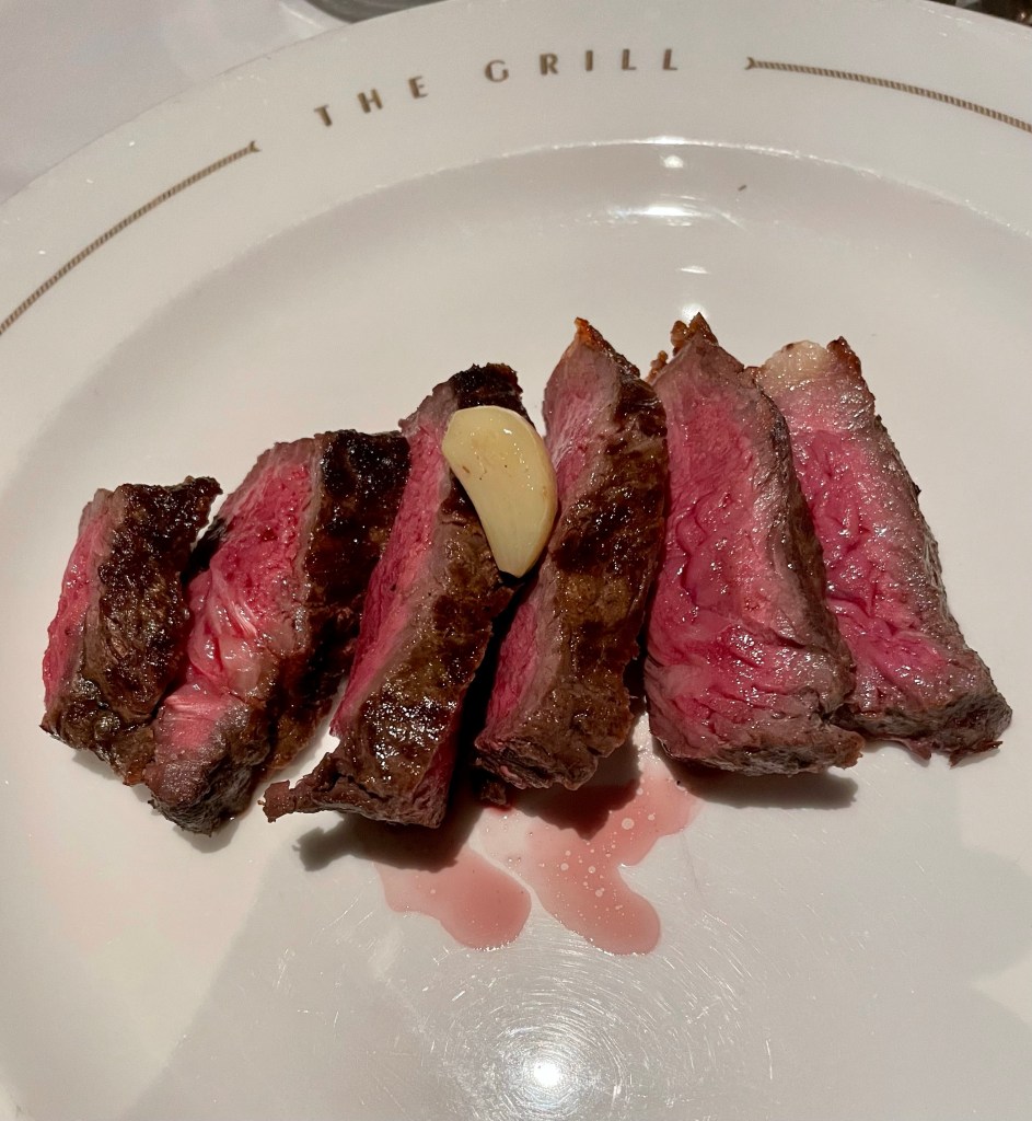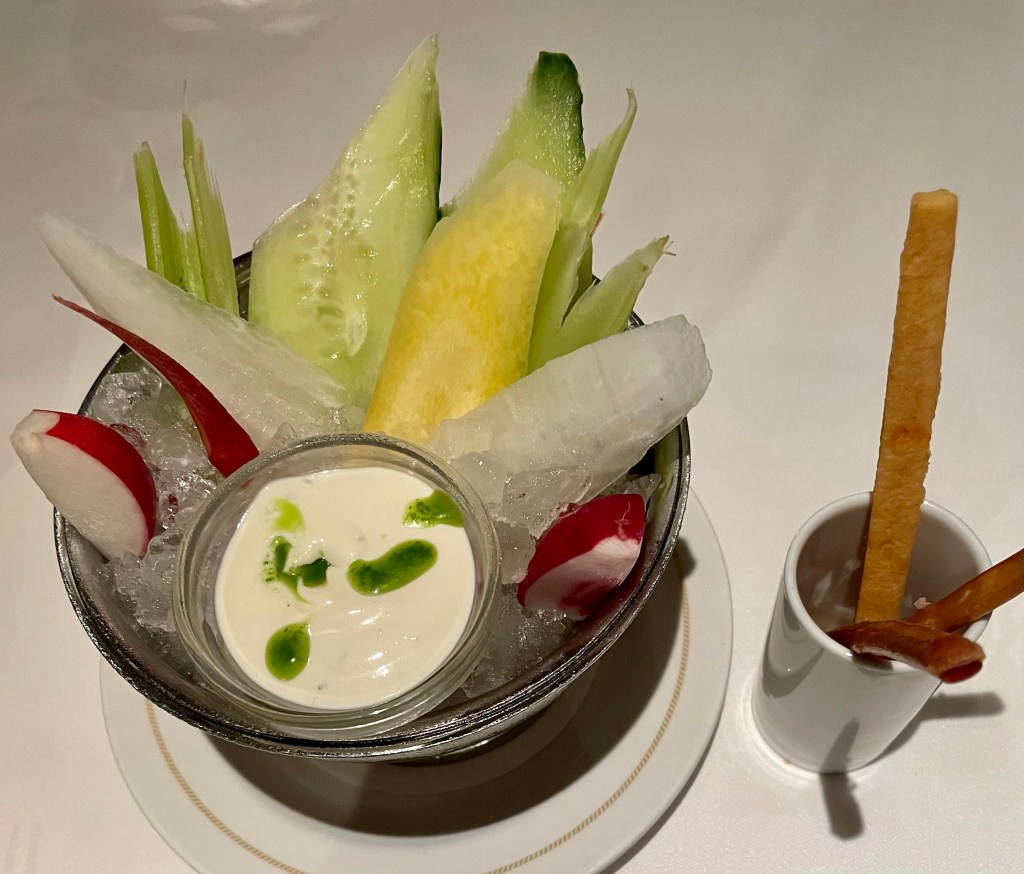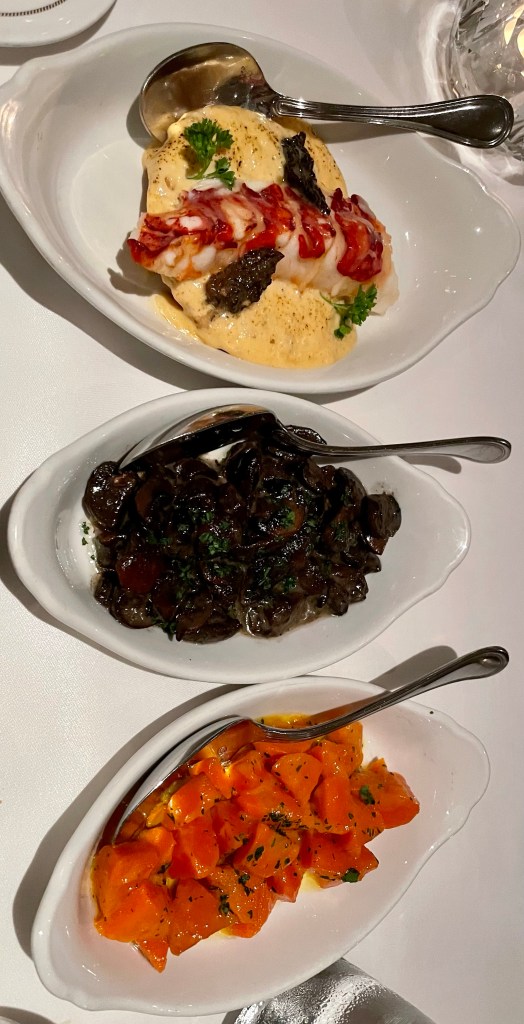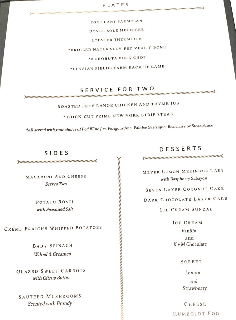 Us at The Thomas Keller Grill for Dinner!Dinner Menu – Page 1!Dinner Menu – Page 2!Starter of veggies and dip with cheese sticks!Caesar Salad prepared table side!Jumbo Lump Crab Cake with Spicy Aioli!Thick-cut Prime New York Strip Steak for Two!Prime New York Strip Steak Sliced!Sides of Lobster Thermidor, Sautéed Mushrooms, and Glazed Carrots!Dark Chocolate Layer Cake!