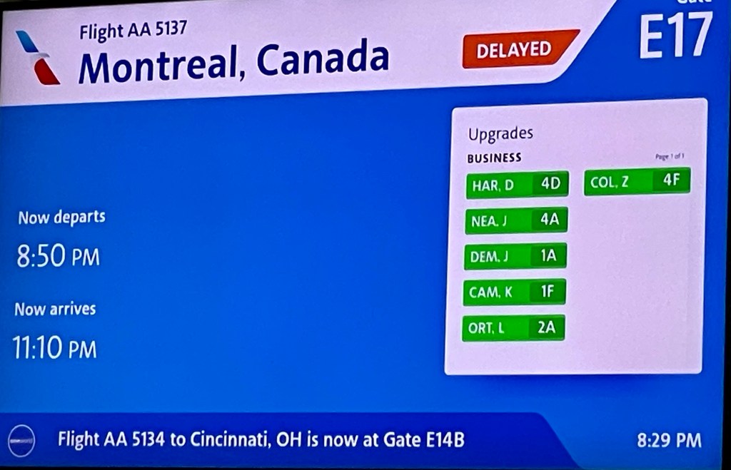 Well we made it to Montreal but luckily we opted not to fly standby this time since the flight was oversold! As some of you know, Kathy is a flight attendant for American Airlines so we normally fly standby and other than the summer months it’s rarely a problem (even though we’ve had our moments!). But it was nice to have a guaranteed seat and not worry about getting called up for standby. We used miles so it was still free but I was surprised at how low the miles were for the ticket but it was only a one way ticket. We’ll fly standby coming back from NYC since there are 3 airports to choose from and tons of flights so it shouldn’t be a problem. But guess what? We got lucky and got upgraded to Business class! I had read where American had just changed their award miles process to give free upgrades where possible. I guess it finally paid off to spend all that money on my American Airlines credit card!! Lol.