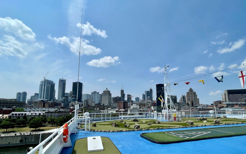 Posted on June 12, 2023 by Jeff DeMaria Pool area! Sports deck with Corn Hole, ShuffleBoard andPutt Putt Golf with the Montreal skyline in the background! Compass Rose – The Main Dining Room! The Theater! The Library! Share this: Click to share on X (Opens in new window) X Click to share on Facebook (Opens in new window) Facebook Like Loading...