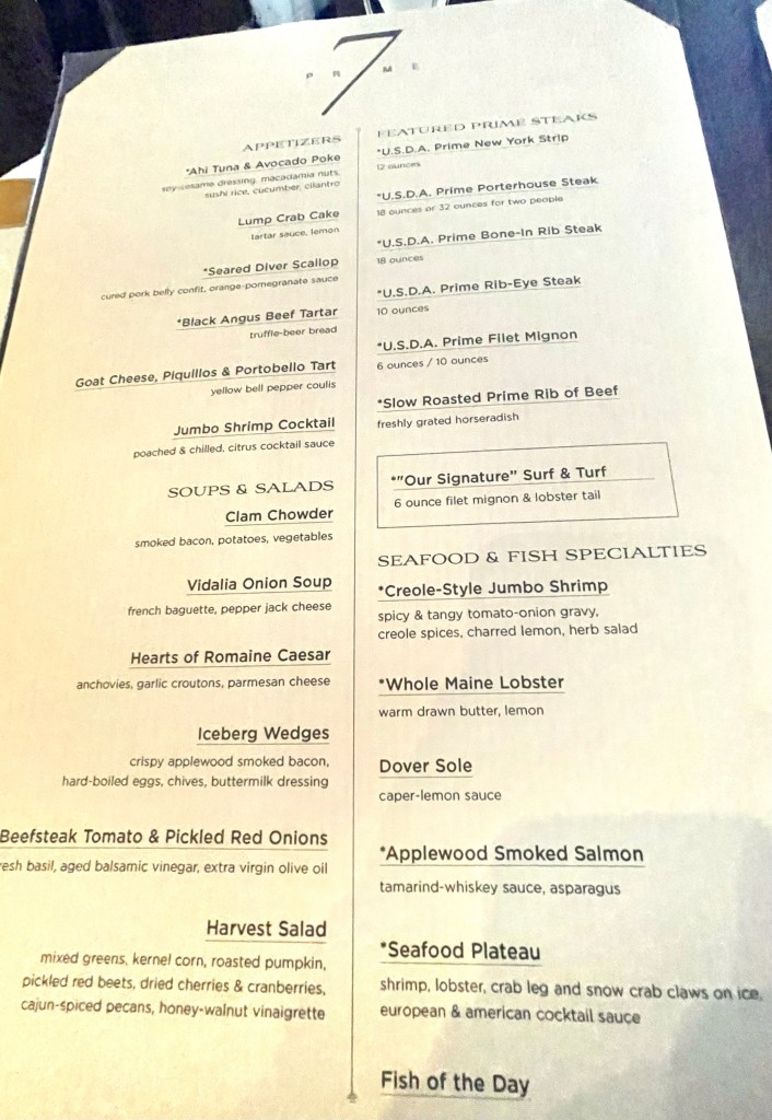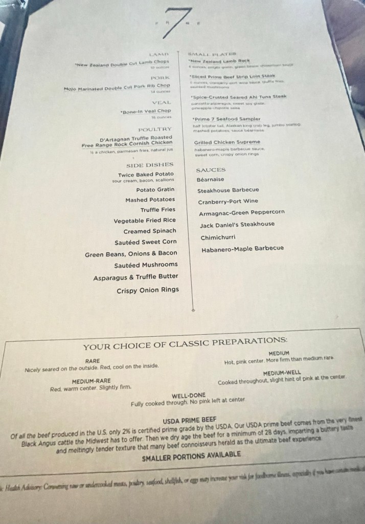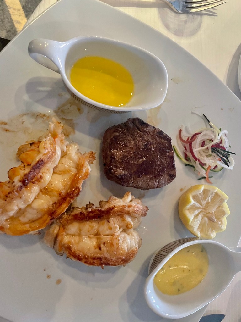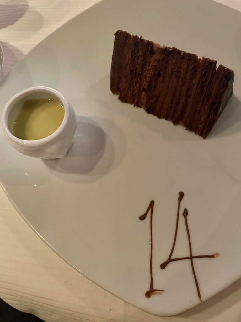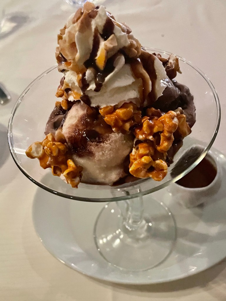 Dinner Menu – Page 1!Dinner Menu – Page 2!Filet Mignon with Bernaise sauce and two large lobster tails with drawn butter! So yummy!14 layer chocolate mousse cake with pistachio sauce (love the “14” inscribed on the plate in chocolate!)Caramel Popcorn Sundae!