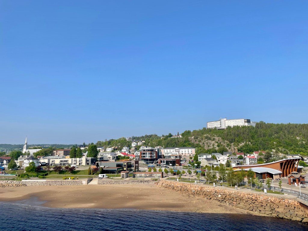 Our port stop today was to Saguenay, which is part of the larger Quebec province. It’s a beautiful, somewhat isolated area up the Saguenay river off the St Lawrence seaway. To get there you go thru one of the few fjord areas in North America, with the fjords being over 1,000 feet tall and the water depths going to over 900 feet deep. We didn’t get to see them going up the river since it was 2 in the morning but got to see them on the way back around 4 PM. Reminded us of Norway!