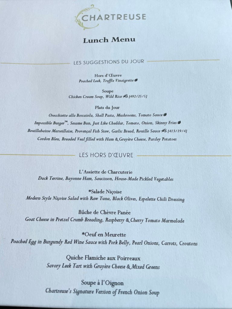 Posted on July 14, 2023 by Jeff DeMaria Chartreuse Lunch Menu – Page 1! Chartreuse Lunch Menu – Page 2! Charcuterie Plate! Octopus with Squid Ink! Afternoon Tea with Nano the Piano Player! Us Next to the Beautiful Chandelier! Share this: Click to share on X (Opens in new window) X Click to share on Facebook (Opens in new window) Facebook Like Loading...