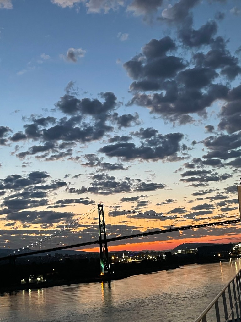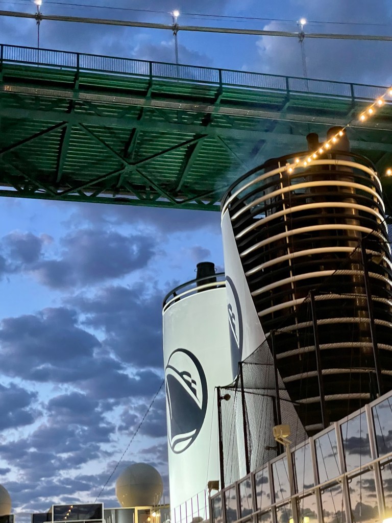 Sailing in to Vancouver early Sunday morning was beautiful. The sun was just coming up and it was a clear day. The other cool thing about sailing in to Vancouver is your cruise ship has to time it just right to have enough clearance to get under the Lions Gate bridge. As you can see by the picture I took, our ship just cleared it by a few feet. Whew!