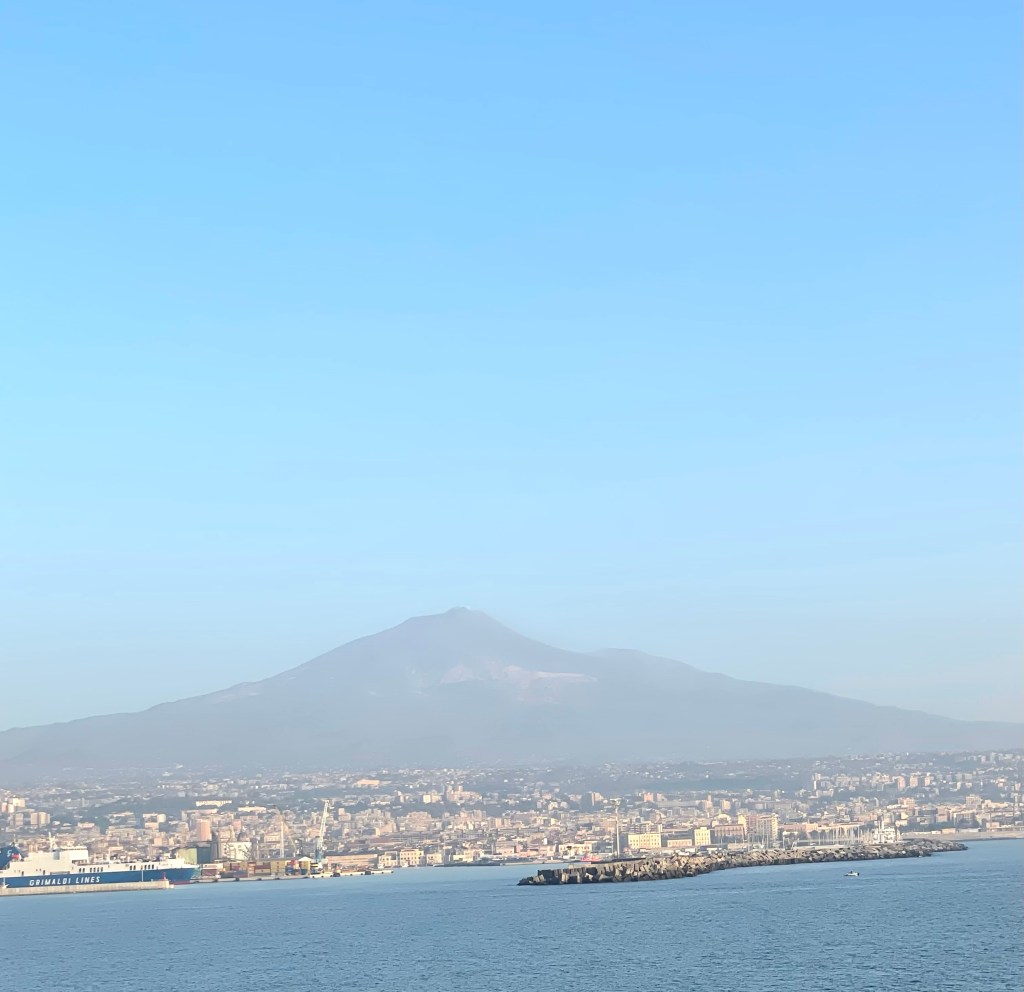 Hi All! We had a very busy (but fun!) day today. We had two excursions so we covered a lot of ground in Sicily. We were docked in Catania but did a morning excursion covering most of Catania and then in the afternoon took a bus about an hour north to Taormina. Even though we were at two different cities, the whole time we could see huge Mt Etna in the background. We did see smoke coming out if it but thankfully it didn’t blow while we were there!