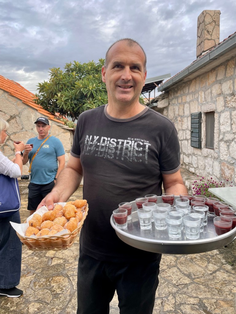 Owner Offering us Homemade Donuts and Wine at 9 AM!! Getting the “Peka” Ready for our Meal!One of the Buildings in the Old Village!Where Our Group had Lunch!Homemade Bocce Court!Old Musical Instruments They Owned!Curing their Homemade Ham!Us Eating their Homemade Ham and Cheese!Owner, his Dad and Brother Singing Croatian Songs!