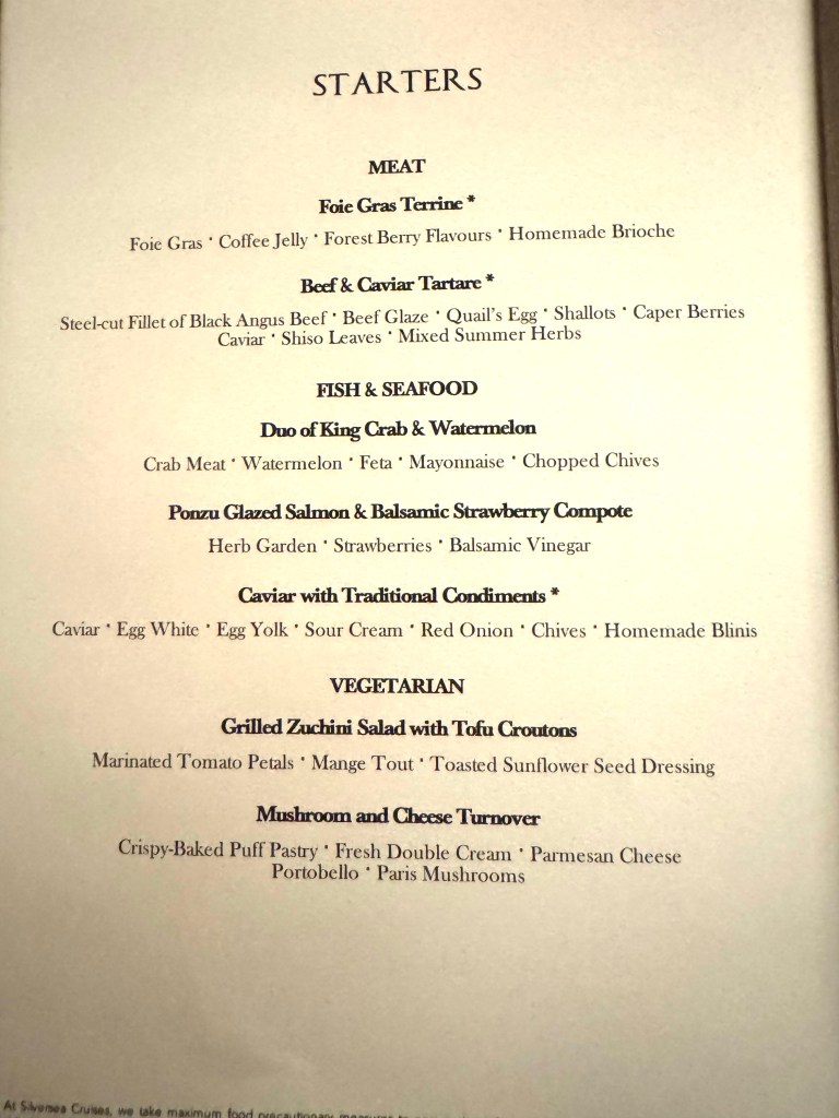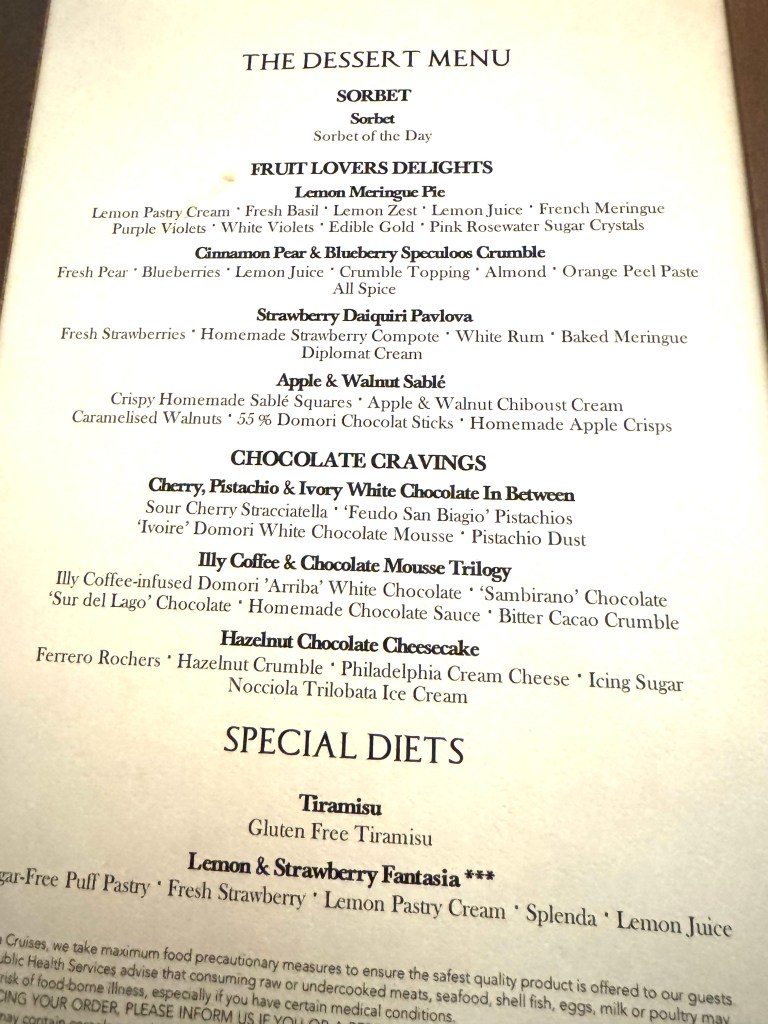 Posted on December 12, 2023 by Jeff DeMaria Dinner Menu – Part 1! Dinner Menu – Part 2! Dessert Menu! King Crab, Caviar and Watermelon- Delicious! Lobster, Grouper, Veggies and Steak Fries! Chocolate Mousse Trilogy! Share this: Click to share on X (Opens in new window) X Click to share on Facebook (Opens in new window) Facebook Like Loading...