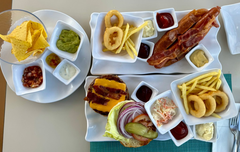 Hi Folks! This is just a quick interim update to show you how healthy we eat on this cruise! Here is our lunch, also called the heart attack special! Lol. Don’t tell our cardiologist!