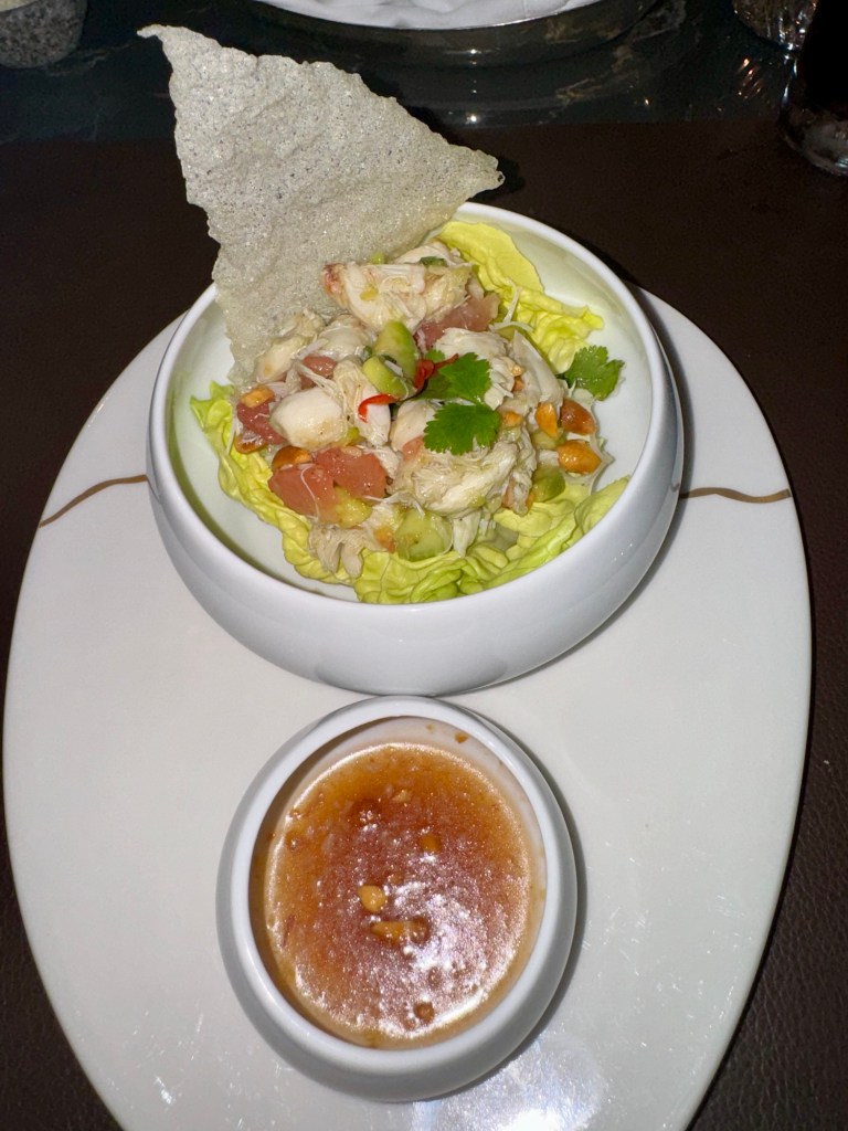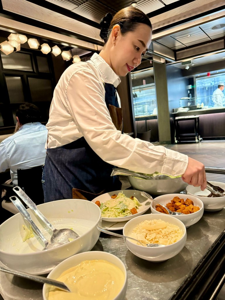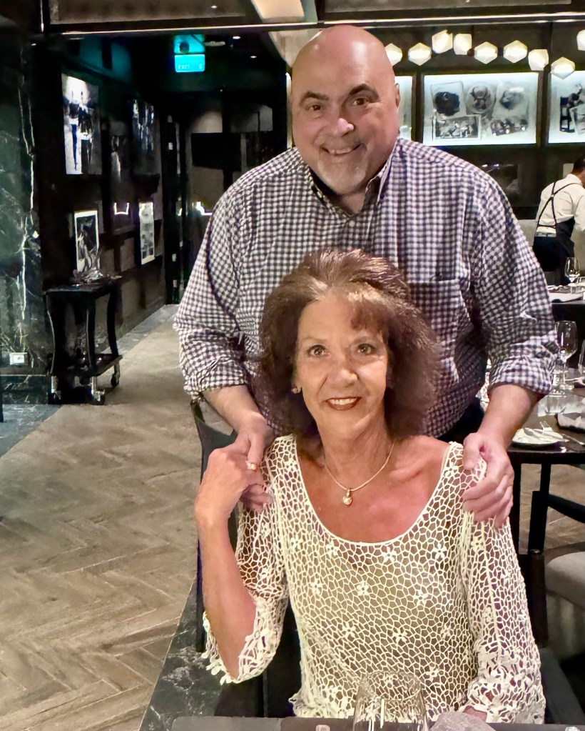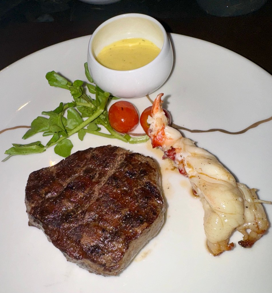 We then got cleaned up and went to dinner at the steakhouse restaurant called Marble & Co. We sat right behind the Captain! Wait, who was steering the ship?? Kathy started with the crab meat salad and I got the fingerling potatoes and caviar. I also had a Caesar salad that was made table-side. For our mains, Kathy and I both got the Filet Mignon and I added a lobster tail (of course!). The brownie for dessert was also yummy!