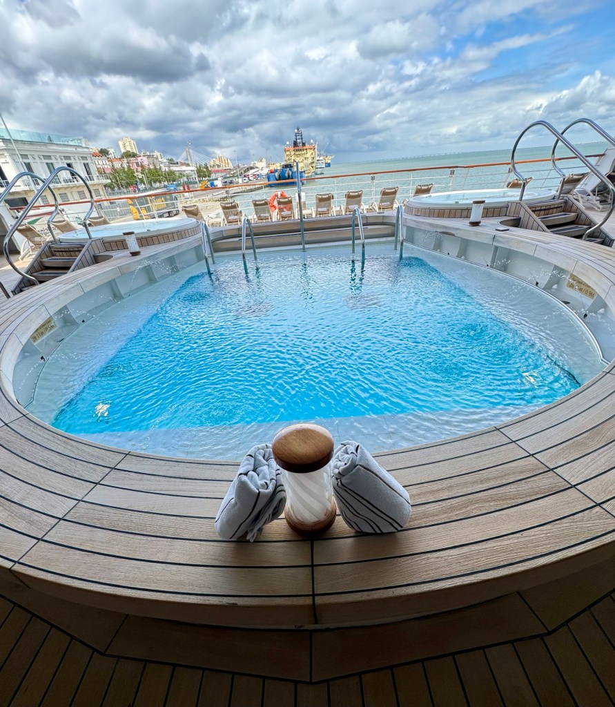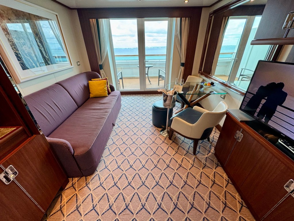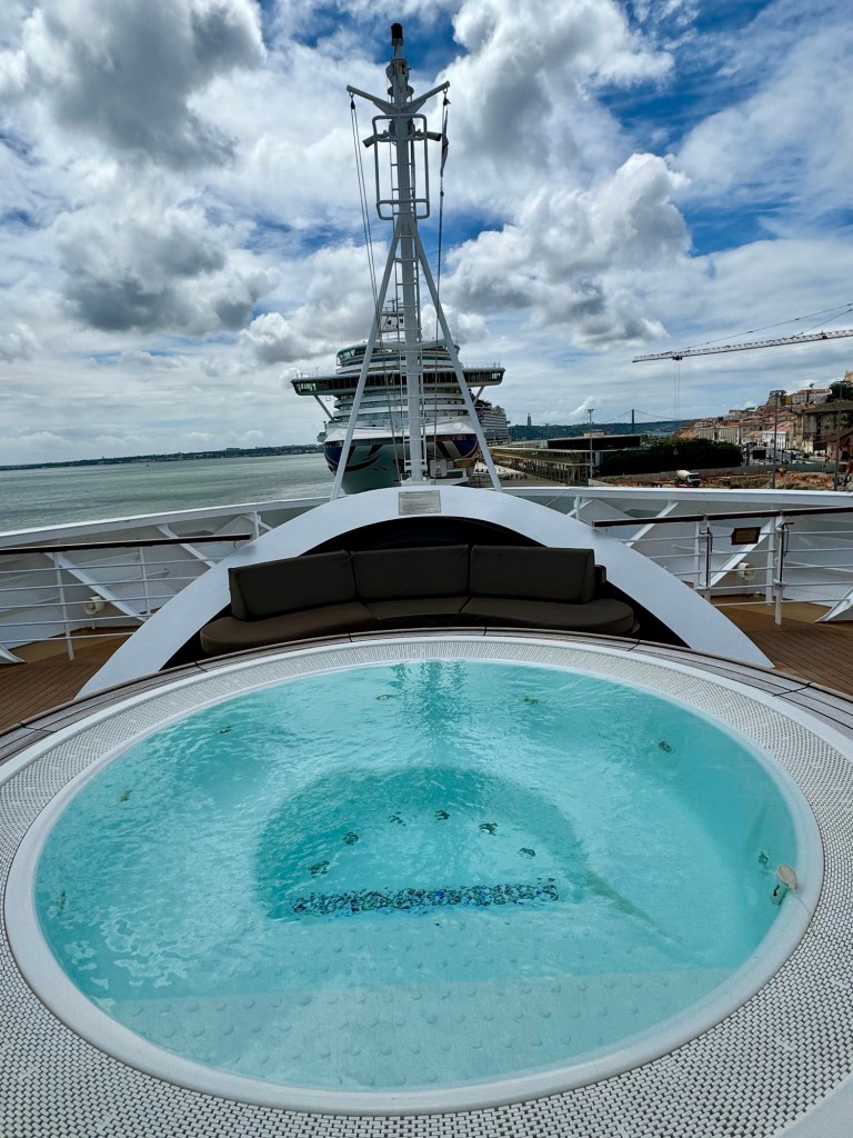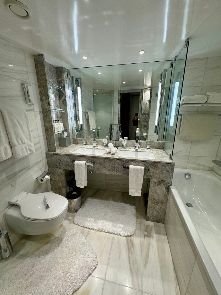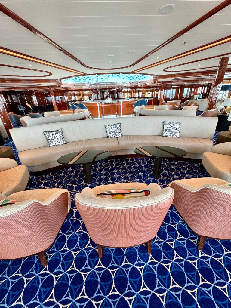 The Observation Lounge!Solis – the Specialty Restaurant!Hot Tub at the Front of the Ship!Pool and Hot Tubs at the Rear!The Restaurant (Main Dining Room)!Our Home Away from Home for 22 Days!Our Separate Sitting Area!Our Balcony!Our Fancy Bathroom with Two Sinks!