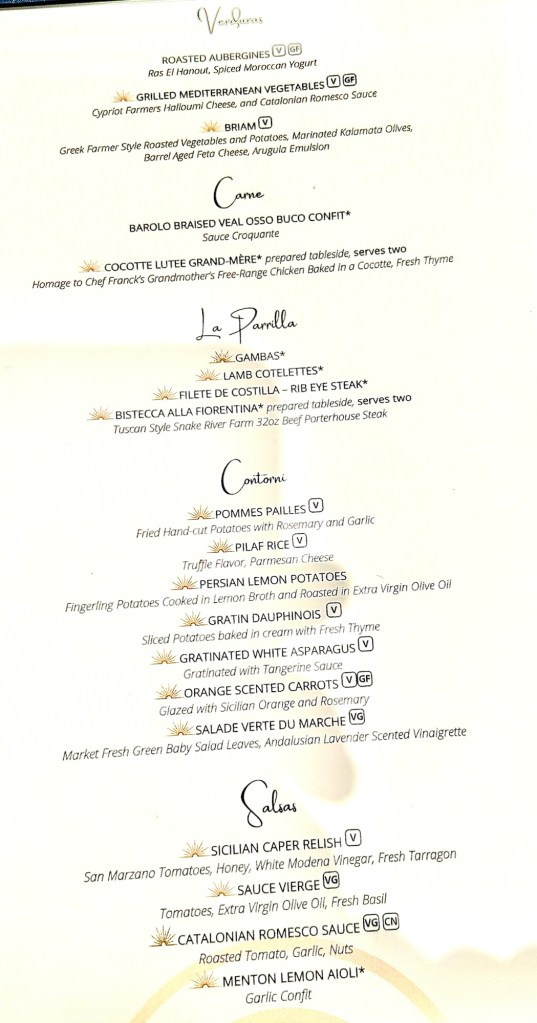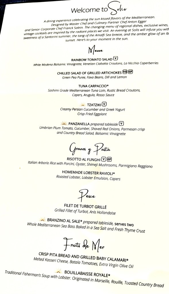 Hi Again Folks! We had a really nice evening. This ship used to have a specialty restaurant named The Grill by Thomas Keller (named after the famed chef that runs The French Laundry restaurant) but they recently changed it to a Mediterranean themed restaurant named Solis. This menu is way more complex with lots more choices but we’re still not sure it’s better than Thomas Keller. We’re eating here at least two more times so we’ll see.