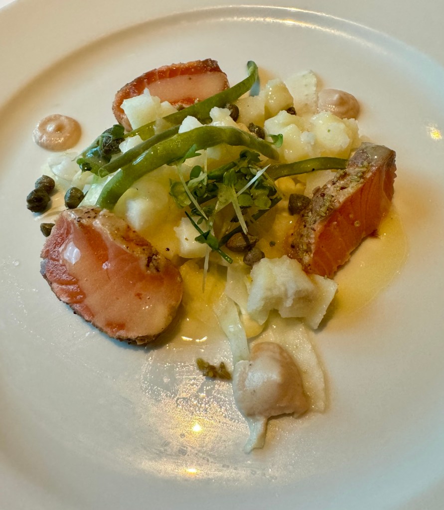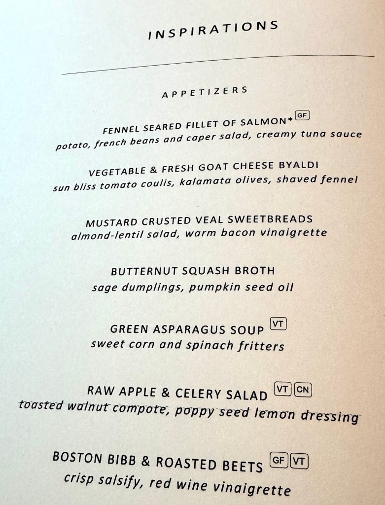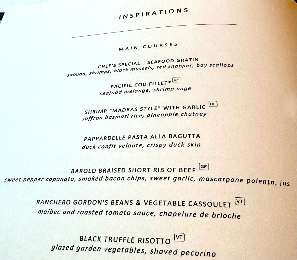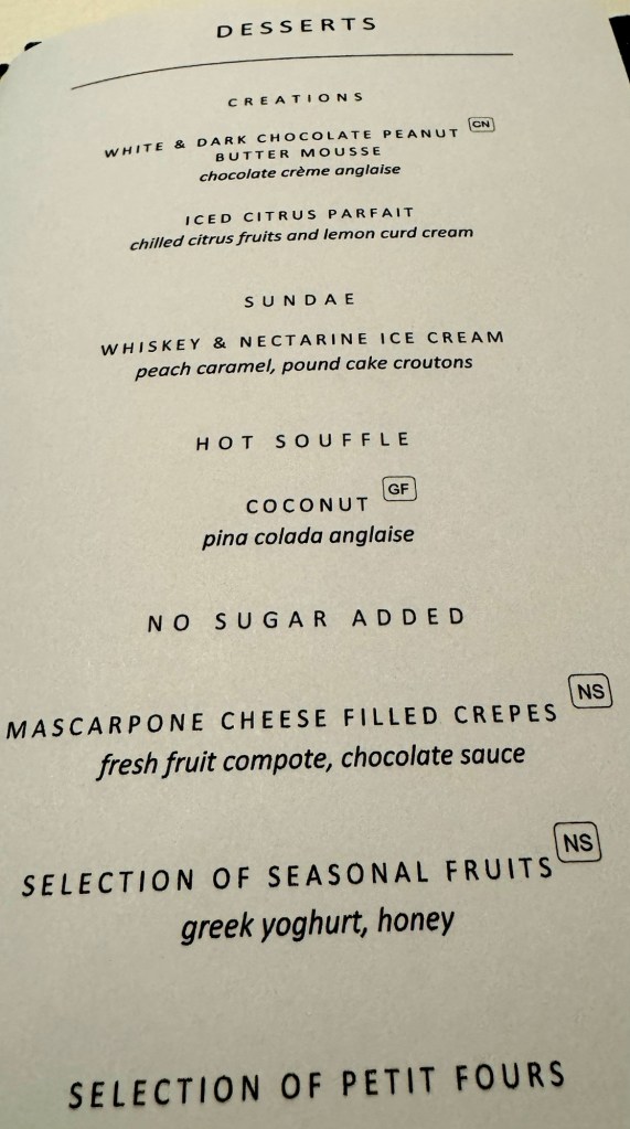 Hi All one last time today! Well Kathy was feeling a lot better and made it out to dinner and the show. YAY! She had the same starter I had last night which was the Caesar Salad with garlic shrimp while I had the tuna (which they called salmon on the menu but you can tell by the picture it’s tuna). I also tried the Asparagus soup which was really tasty.