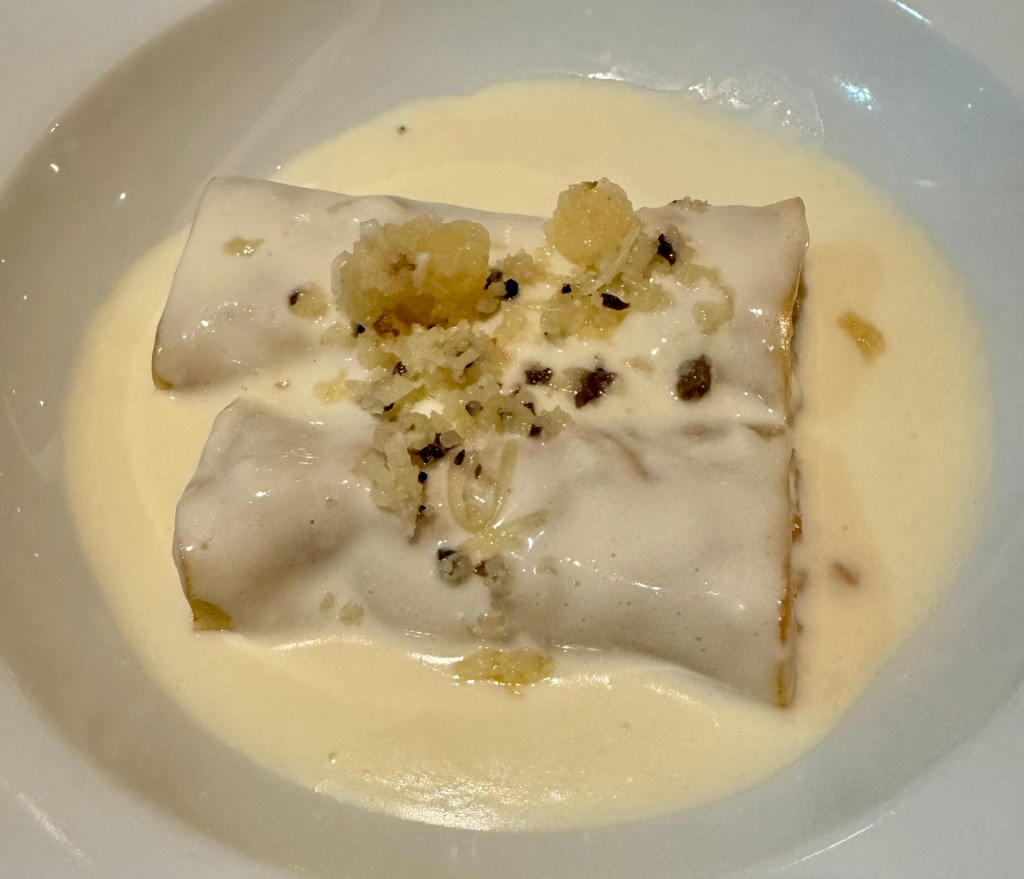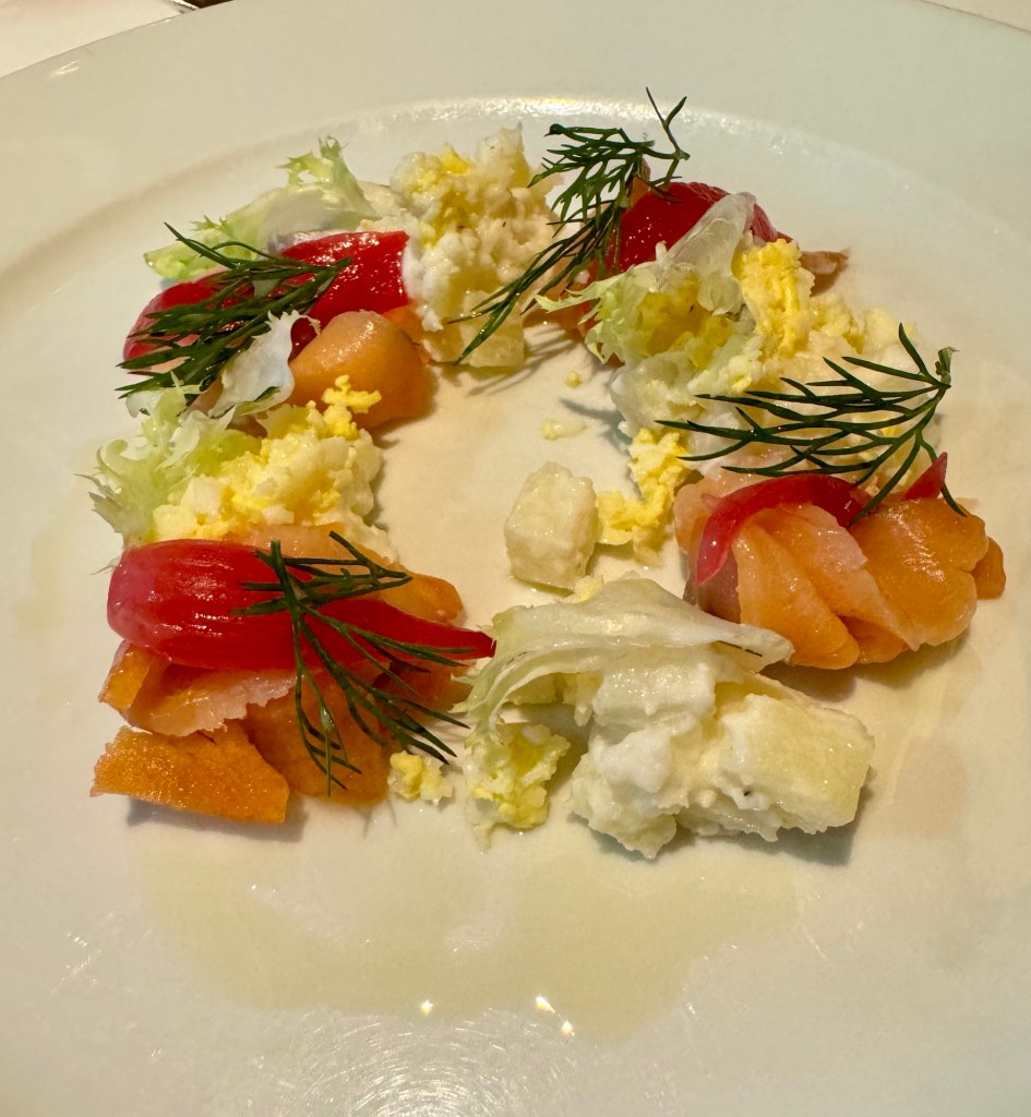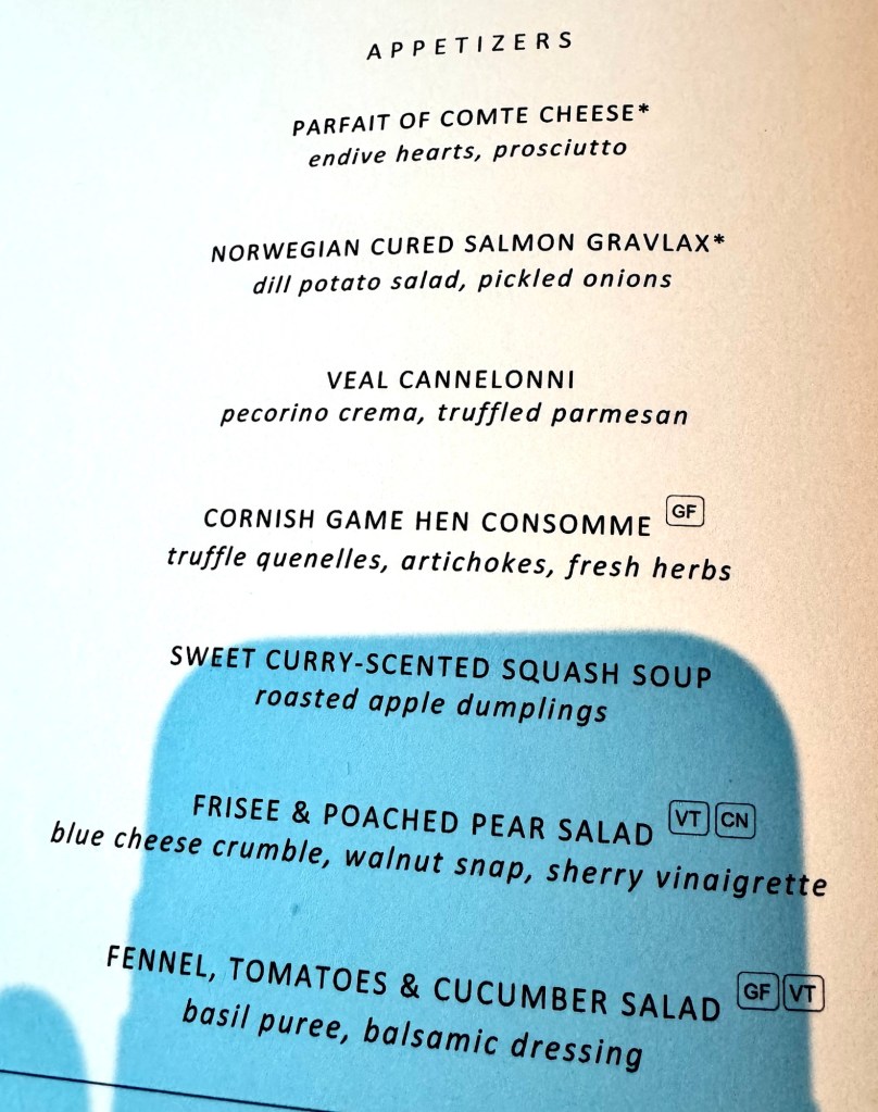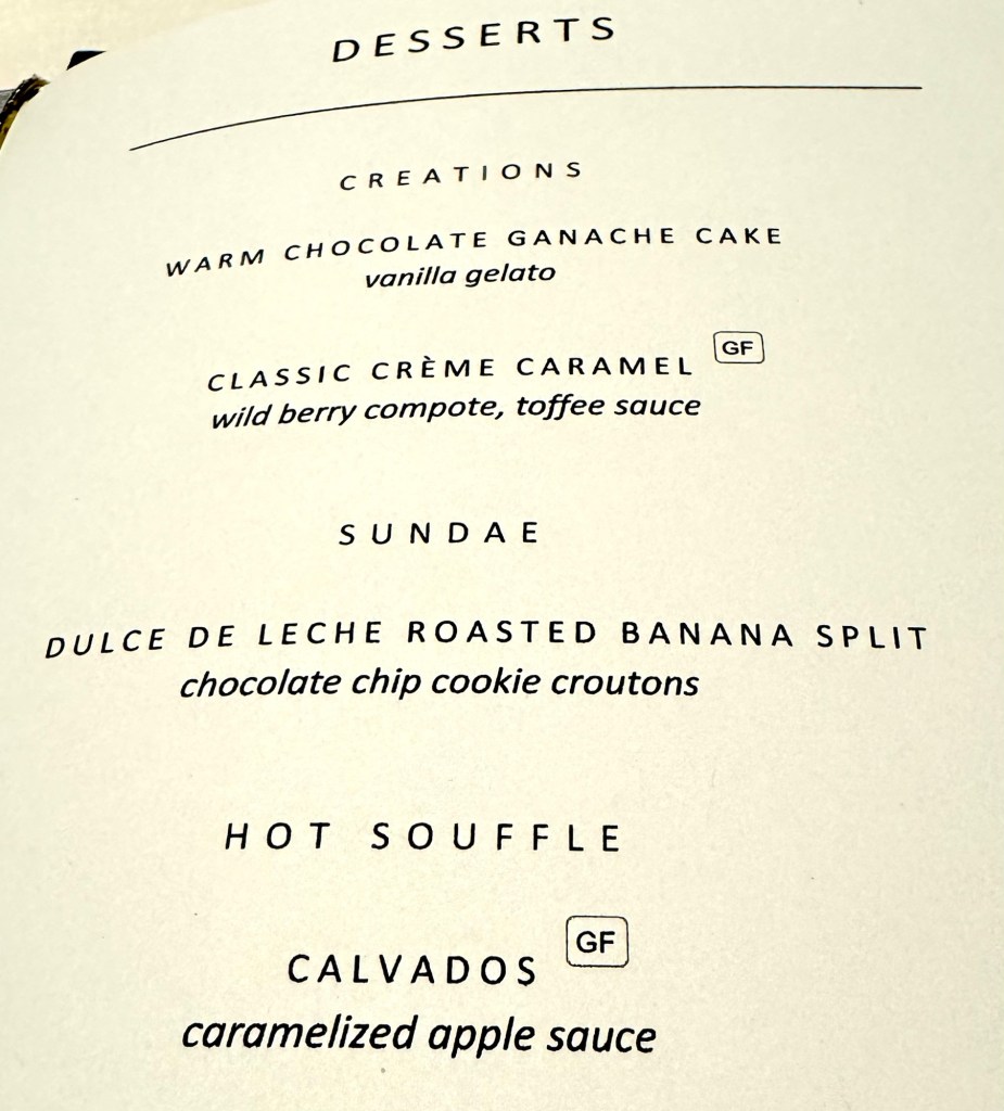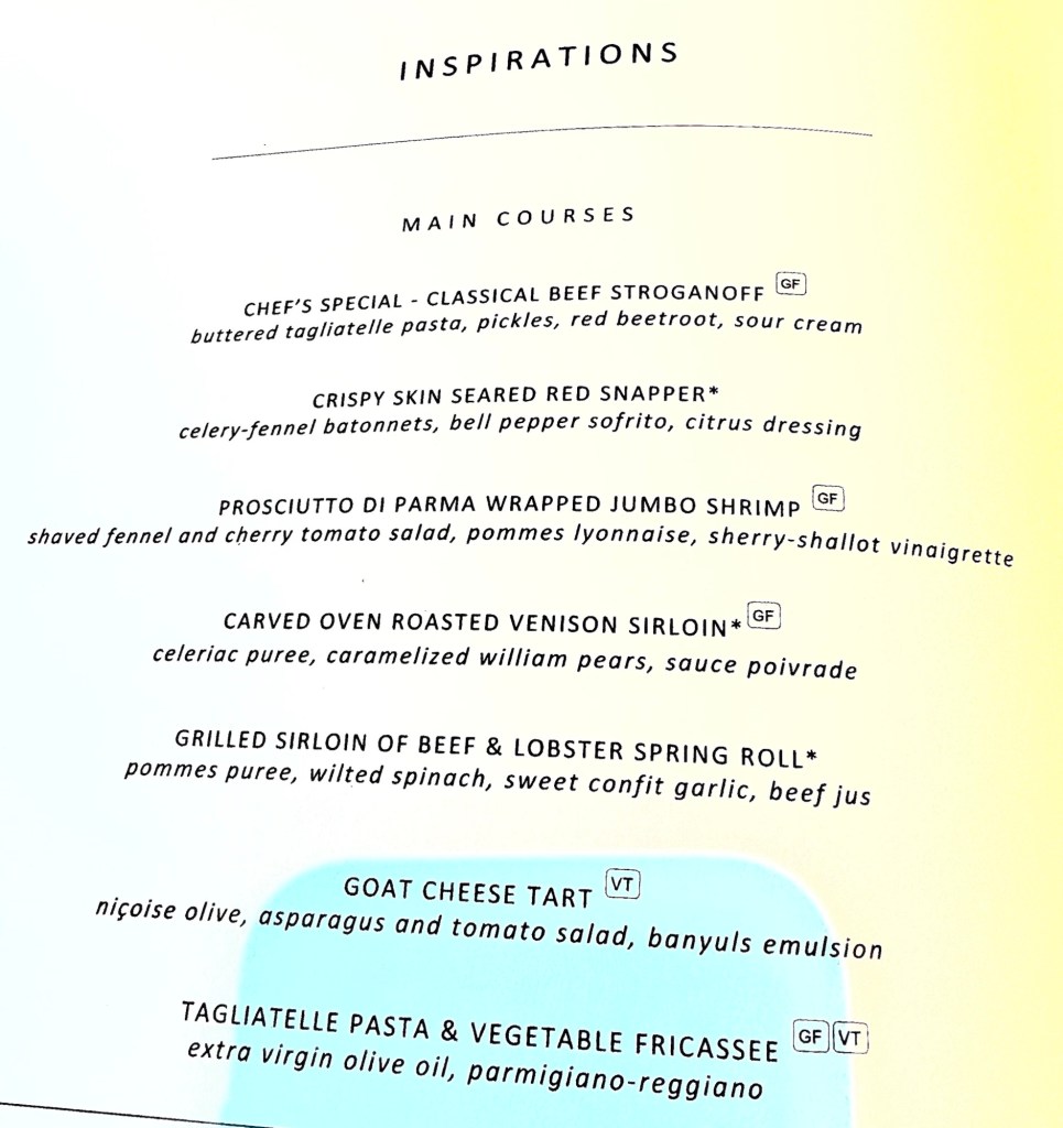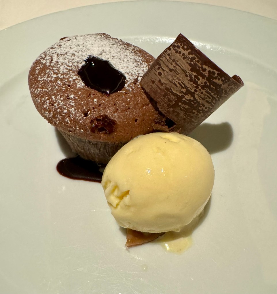 We had another nice dinner in the main dining room. We both had the veal cannelloni for our appetizer and I added the Norwegian cured salmon gravlax as well. Kathy had the grilled sirloin of beef and lobster spring roll (of course!) and I had the prosciutto wrapped jumbo shrimp (and added the lobster spring roll, of course!). For dessert we both got the warm chocolate ganache cake. It was all very tasty!