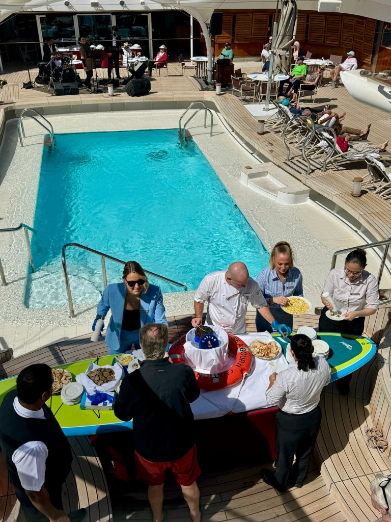 We then went to the Seabourn “signature event” of Caviar by the pool. Last year, when we were on this ship in the Caribbean, they did Caviar in the surf along the beach. That was fun. You can get unlimited Caviar anytime you want on this ship. Well, LA-TEE-DAH!