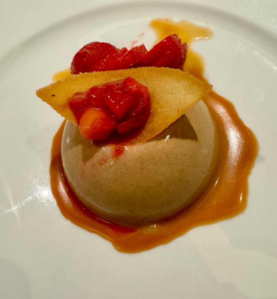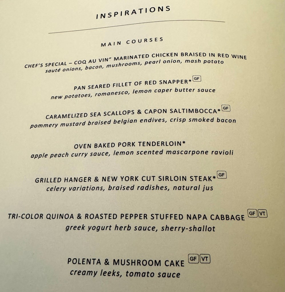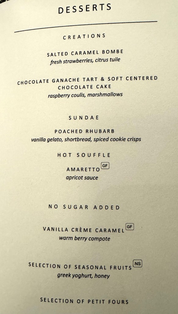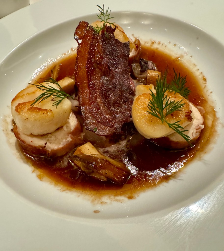 Hi Again Folks! We had another great evening starting off with a yummy dinner. Kathy and I had the exact same meal for all courses (which doesn’t happen often!). We started off with both the seafood souffle and the mushroom soup for appetizers, the Caramelized sea scallops with chicken saltimbocca for our main and the salted Carmel bombe as our dessert. Just like twinsies!