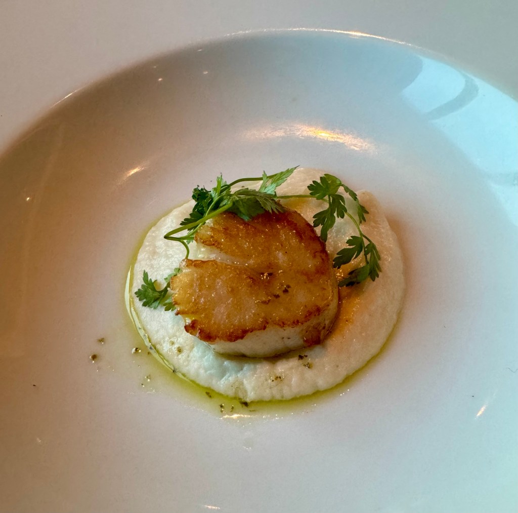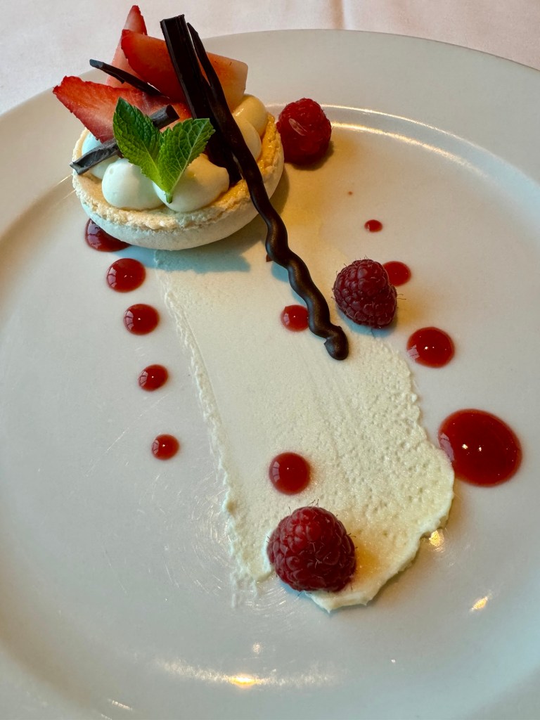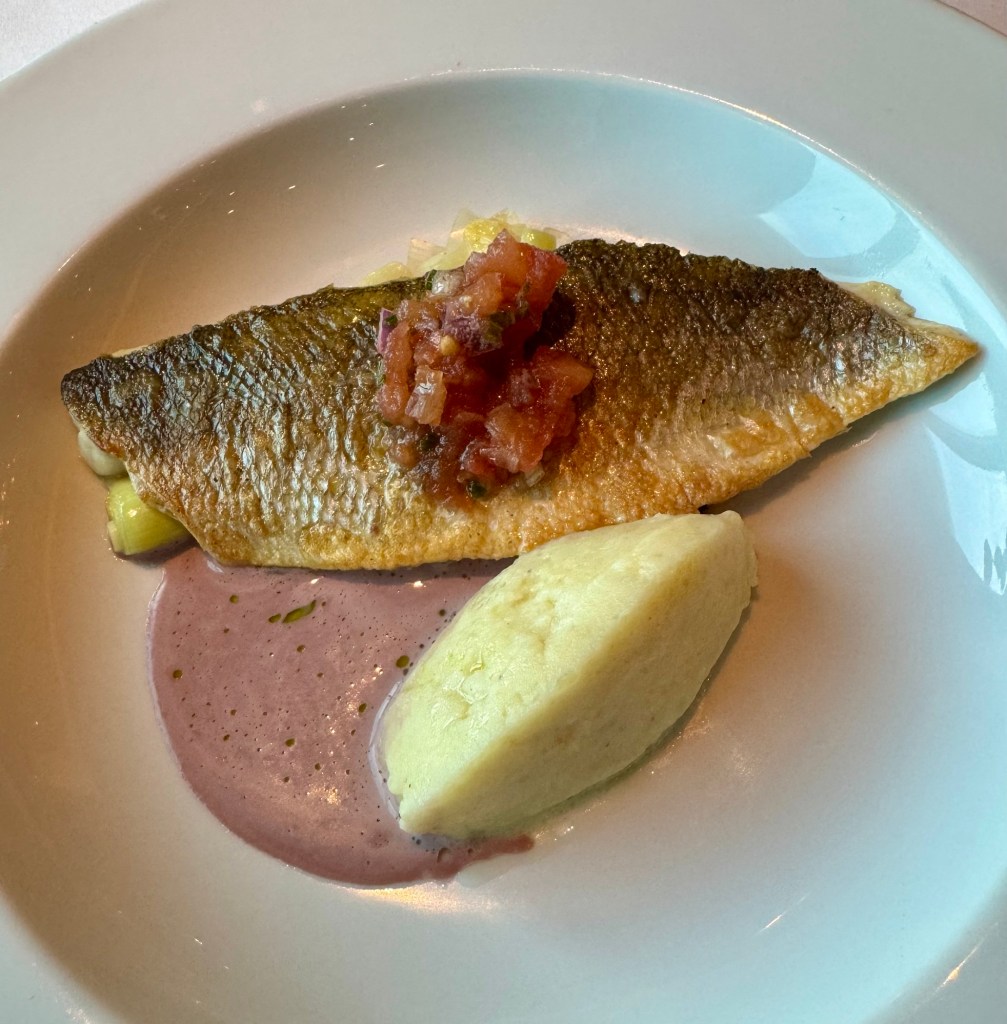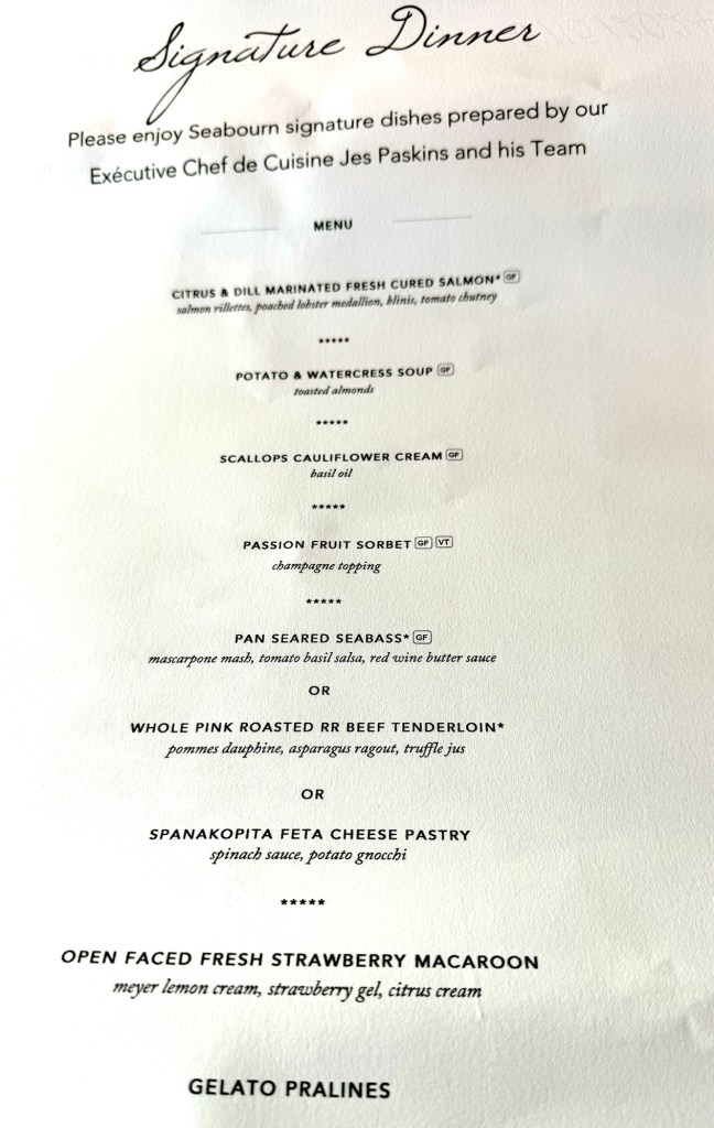 Hi Again Gang! Dinner tonight was called the “Chef’s Dinner” and it had a set menu on a scroll (well LAH-TEE-DAH!). The only choice we had was for the mains and tonight Kathy and I weren’t twinsies since we ordered different mains! Kathy had the Beef Tenderloin and I had the Sea Bass. Both were excellent!
