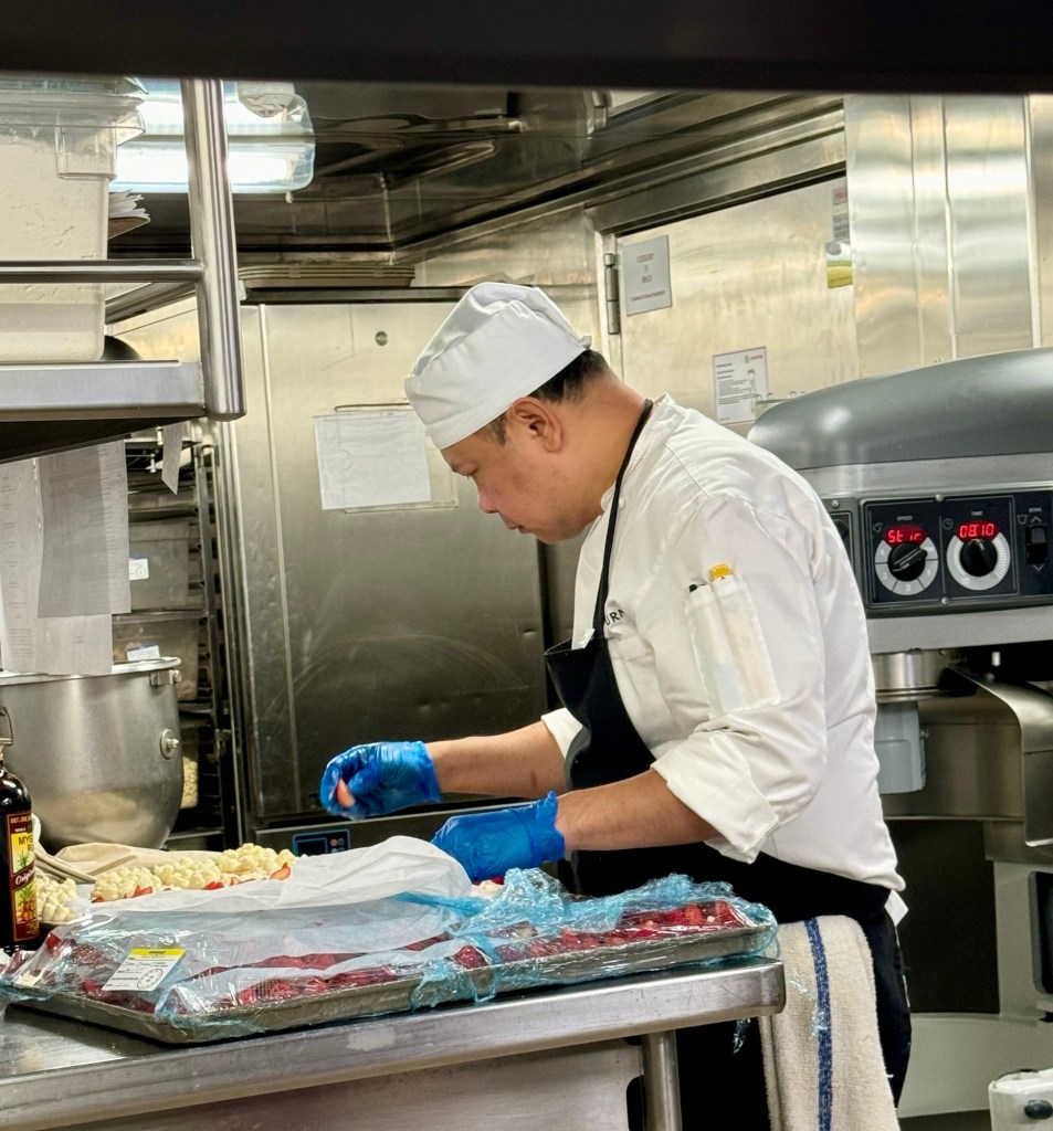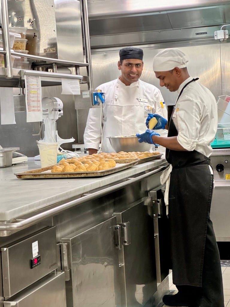 After that we did a galley tour. The Head Chef named Jes gave us the tour. He’s from England and he was a hoot! He has spent 28 years being a chef on cruise ships, the last 14 of which have been on Seabourn ships. He told us he has 65 chefs on board to help him and they all have to have at least 5 years experience working at a 5 star hotel (so that’s why the food is so good!). As the Head chef he tastes a sample of every dish every night before it’s mass produced for the guests. His team works 14 hour shifts per day for 4 months straight with no days off. Then they get 2 months off. Whew… get tired just thinking about it!