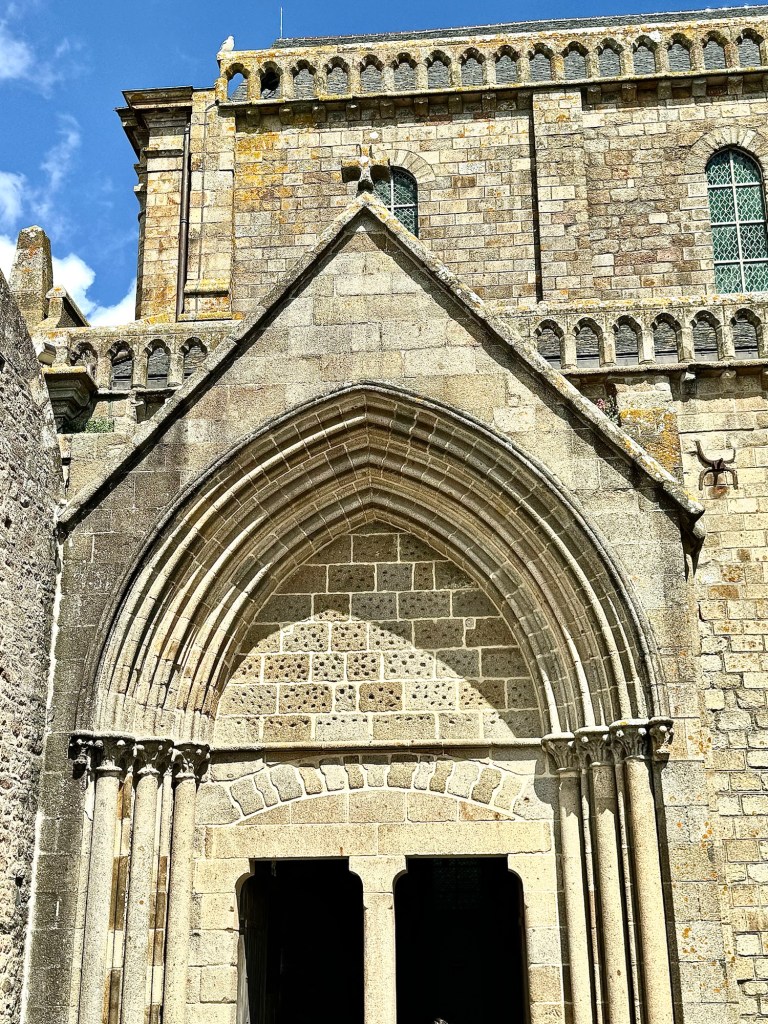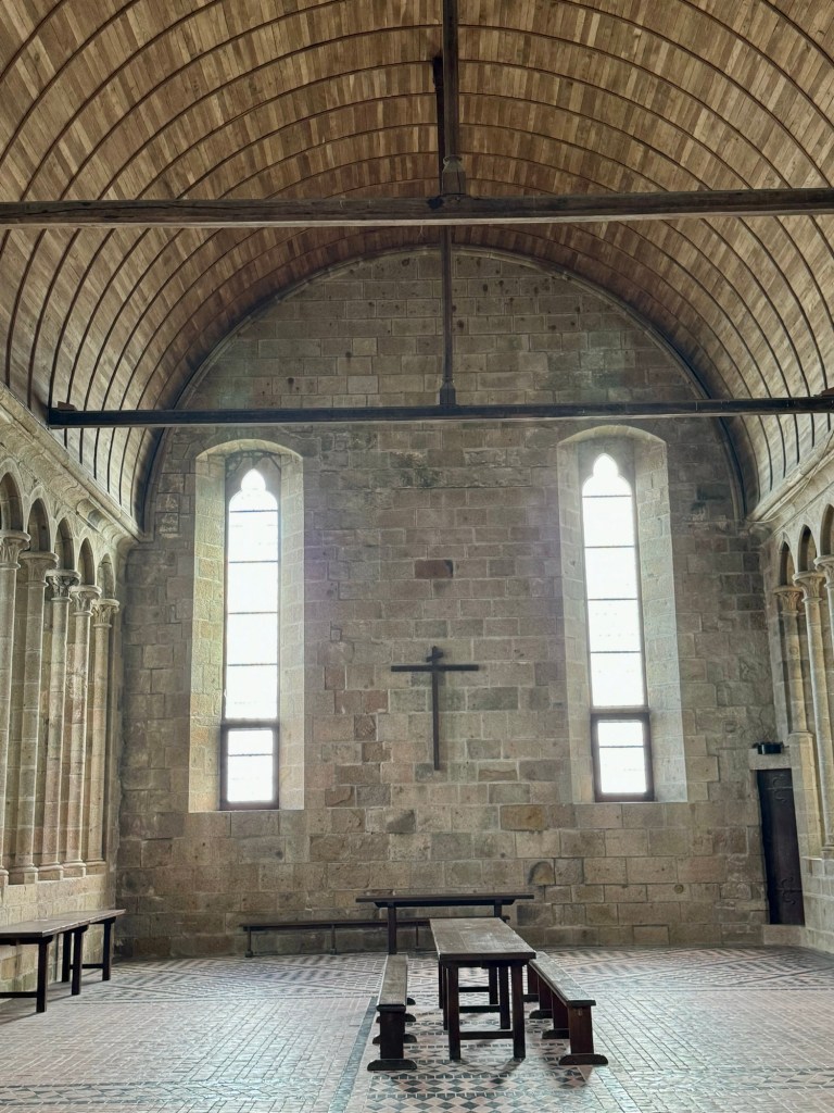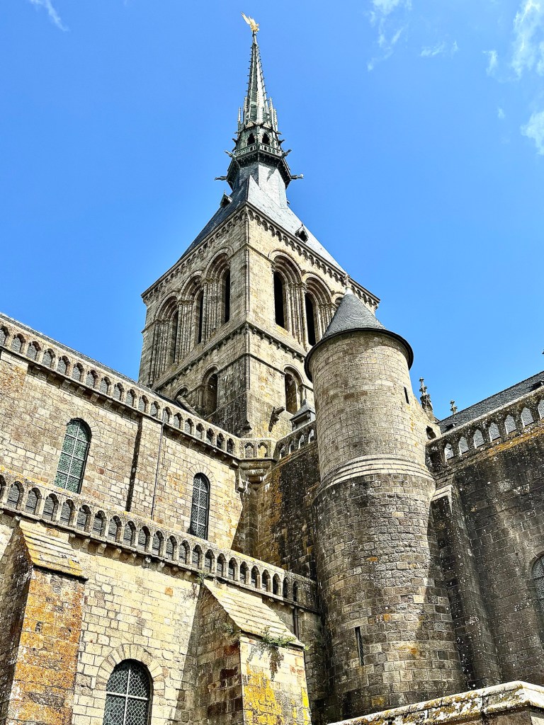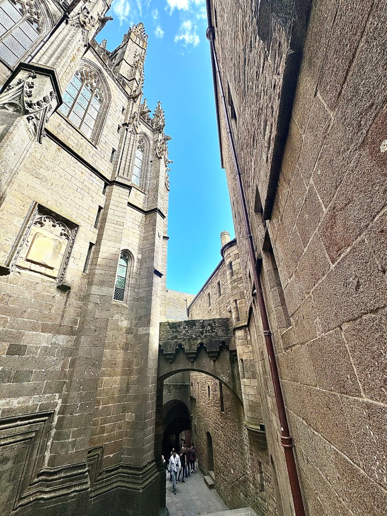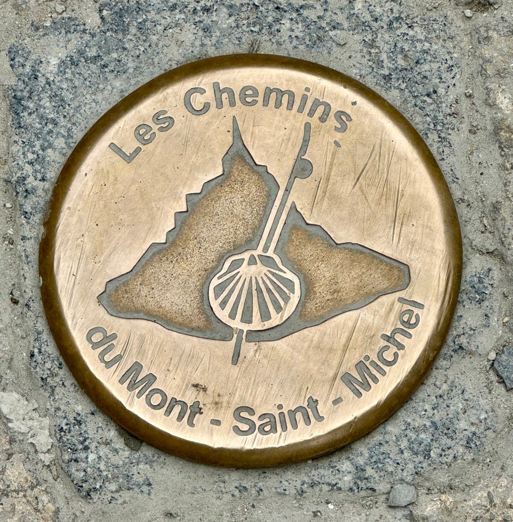 One of the Alleys Leading Up!Looking up to the Very Top!The Top – Michel the Archangel!Cool Doorway!A Different View to the Top!Looking out over the Water from the Top!Another Chapel near the Top!Inside the Abbey!The Cloisters!Where the Monks Worked and Prayed!Kathy at the Doorway to MSM!Emblem on the Ground Designating the Path (Les Chemins) to MSM!