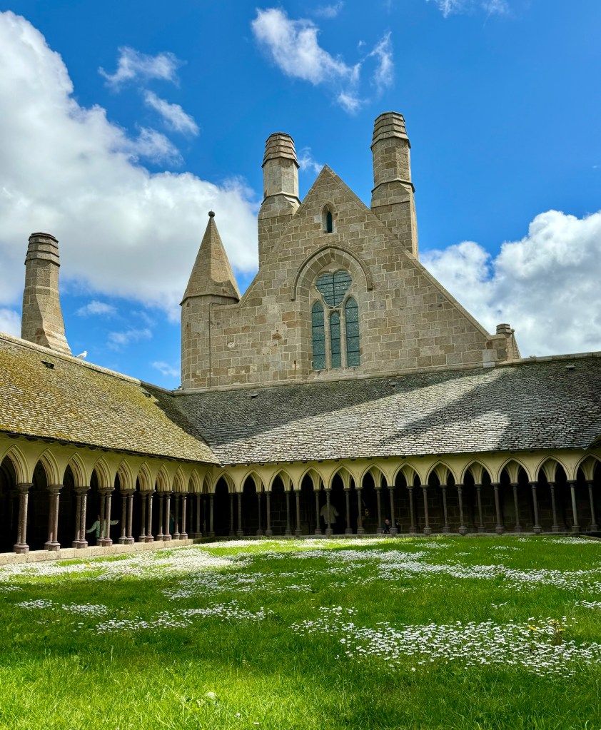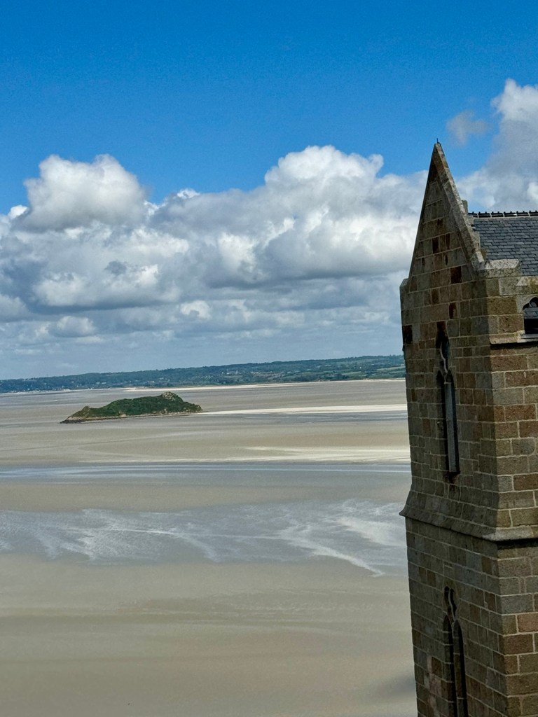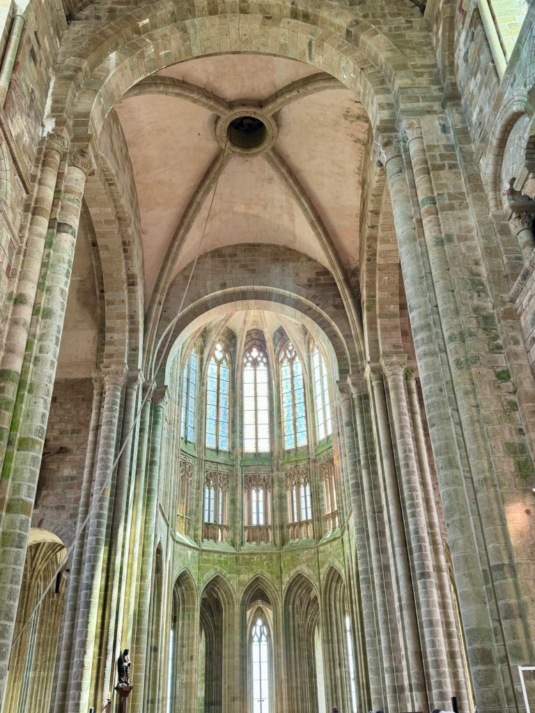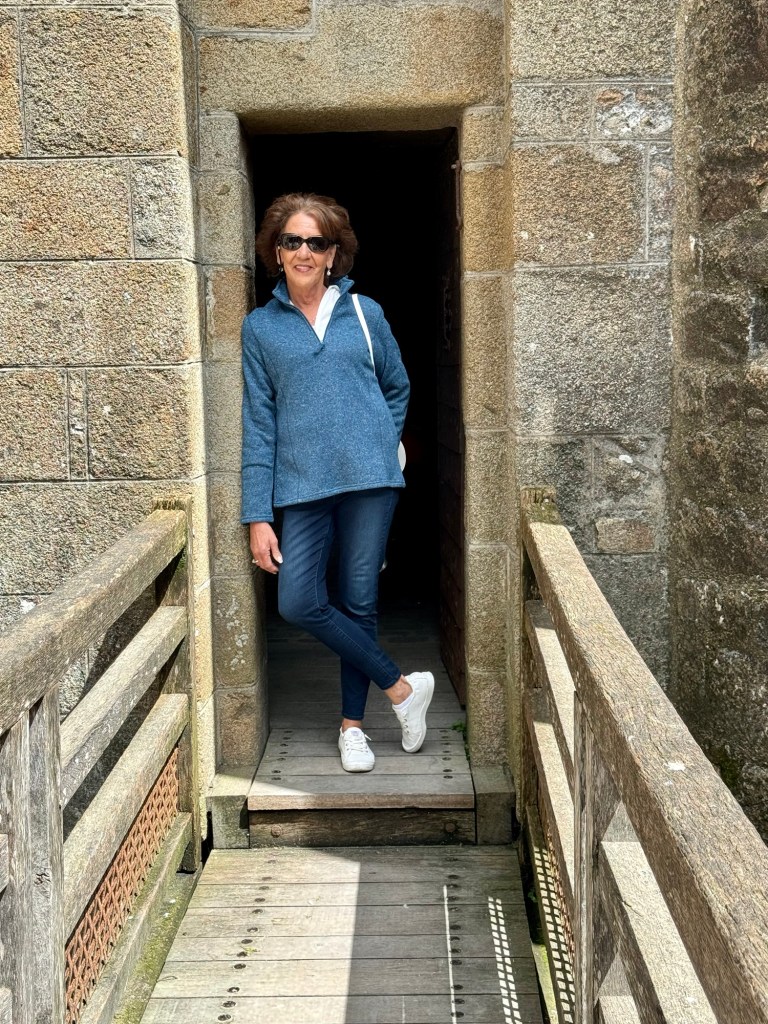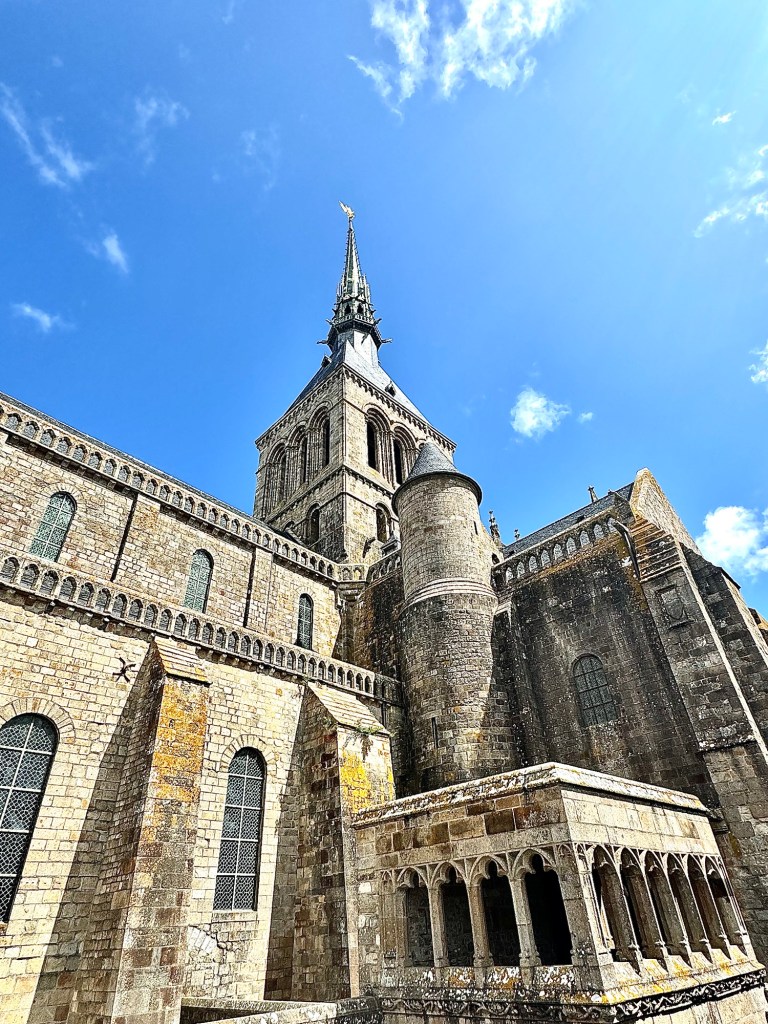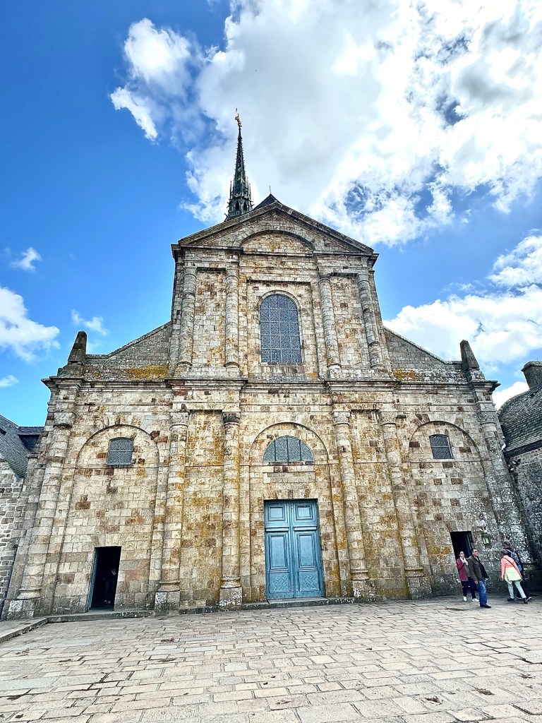 One of the Alleys Leading Up!Looking up to the Very Top!The Top – Michel the Archangel!Cool Doorway!A Different View to the Top!Looking out over the Water from the Top!Another Chapel near the Top!Inside the Abbey!The Cloisters!Where the Monks Worked and Prayed!Kathy at the Doorway to MSM!Emblem on the Ground Designating the Path (Les Chemins) to MSM!