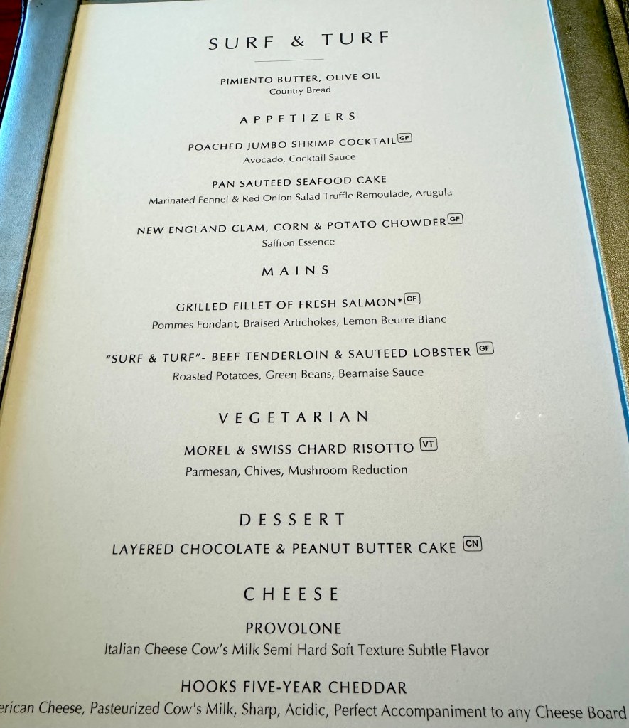 Hi Again Folks! Well Seabourn knows us well and to commemorate our last day, they were nice enough to have surf and turf on the menu! And that was in the casual restaurant, not the formal restaurant. And we were glad since we wanted to eat quicker to get to the show since there was only one tonight.