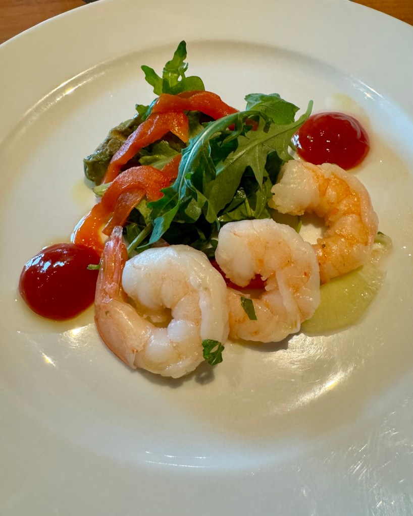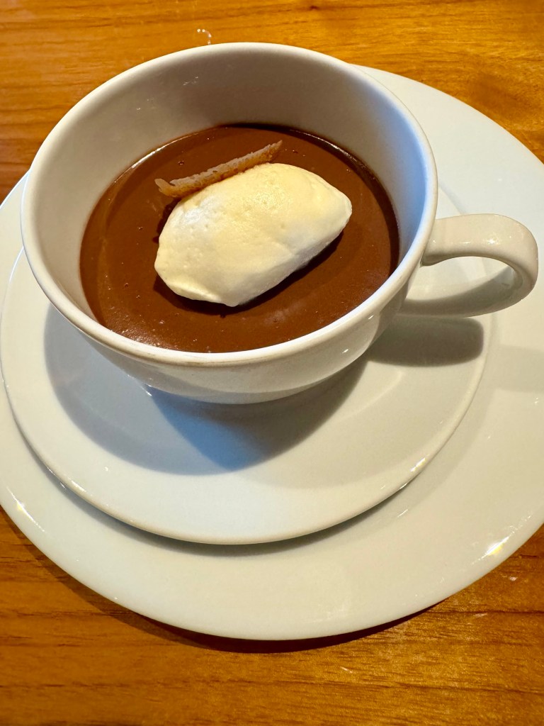 Kathy and I both had the jumbo shrimp appetizer and the surf and turf as our main. But I snuck in an extra appetizer of the New England clam, corn and potato chowder soup. For dessert Kathy got the chocolate and peanut butter cake and I got the chocolate pot. Both very yummy!