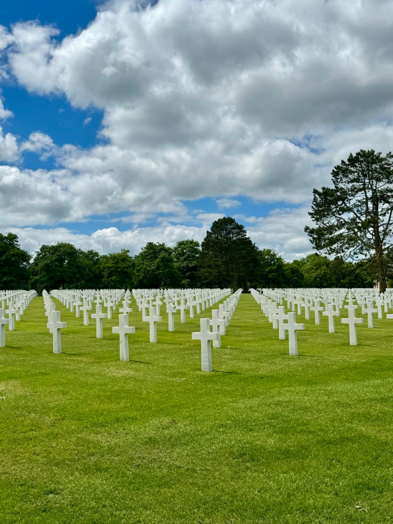 If you ever get the chance, go to Normandy and take a D-Day beaches tour. It will make you proud to be an American. There are so many memorials to all the soldiers that gave their lives for the cause so we can all live in freedom. But the most moving scene was the American Cemetery with all its white crosses lined up in the perfectly manicured lawn. As we were walking someone played both the National Anthem and Taps. It gave you goose bumps.