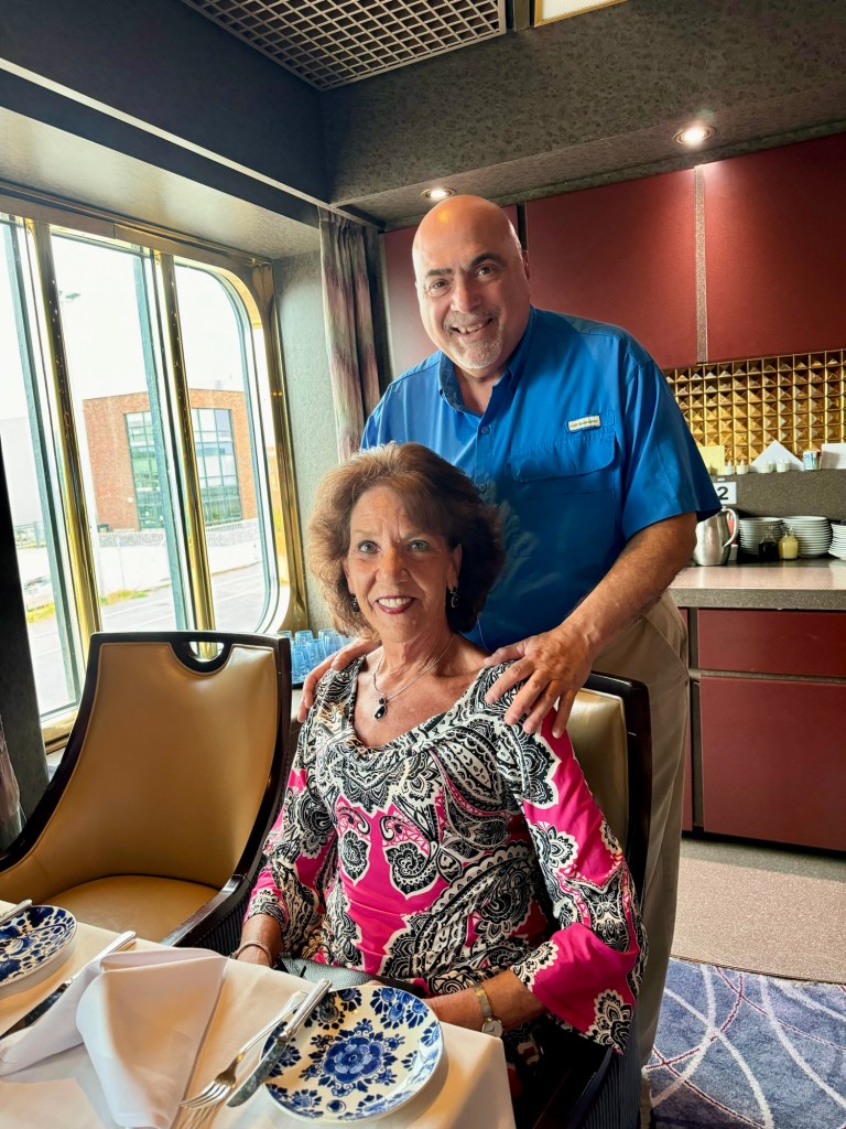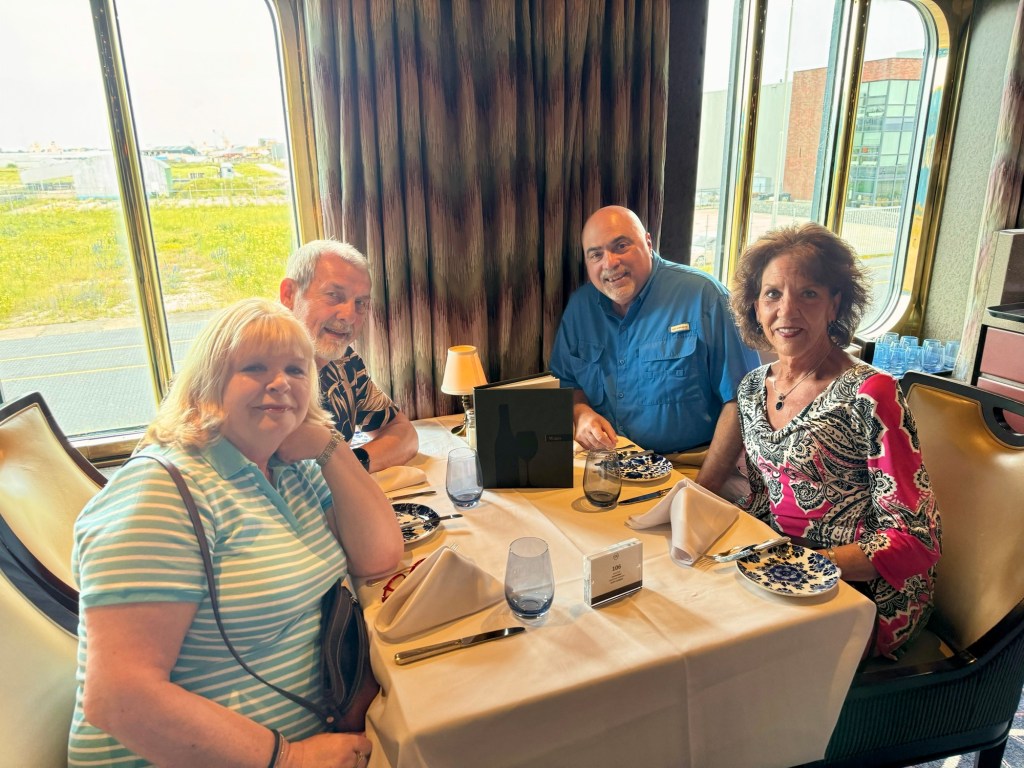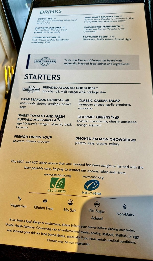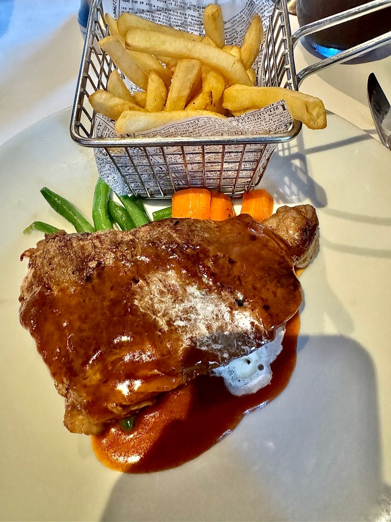 Hi Again Folks! Well the wifi on the ship works great! Thank you Elon Musk for StarLink! After getting cleaned up we went to dinner with Sue and Stuart. The food and service was very good. Kathy and I both had the NY Strip steak (of course!) for our mains. Kathy had the French Onion soup and the seafood salad for starters while I had the salmon chowder soup and the cod slider. All yummy. We topped it off by both getting the chocolate sundae.